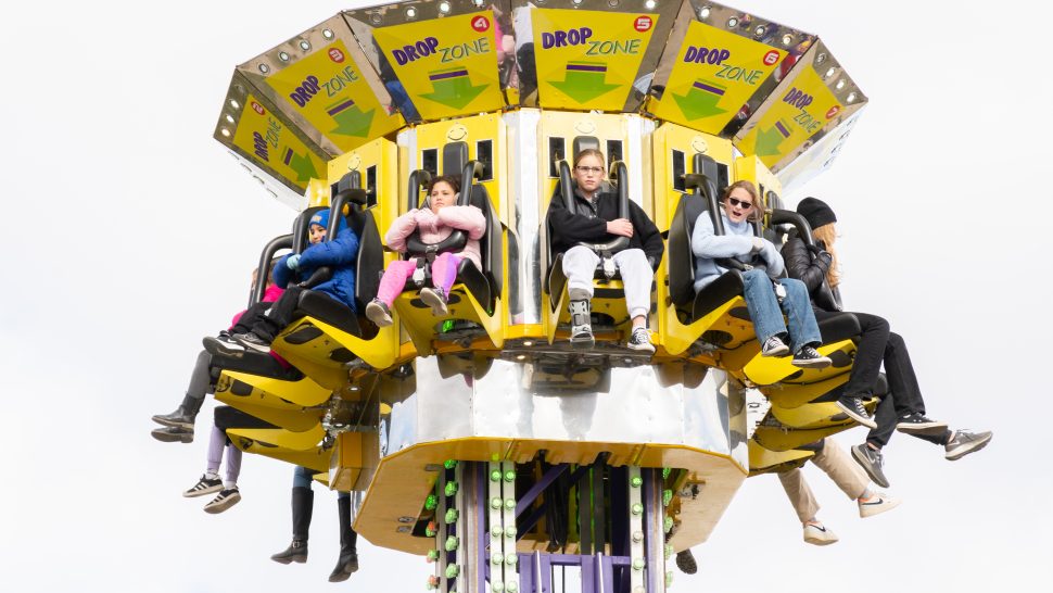 Kids on the “drop zone” screamed as they plummeted toward the ground at a busy midway, complete with a Ferris wheel.