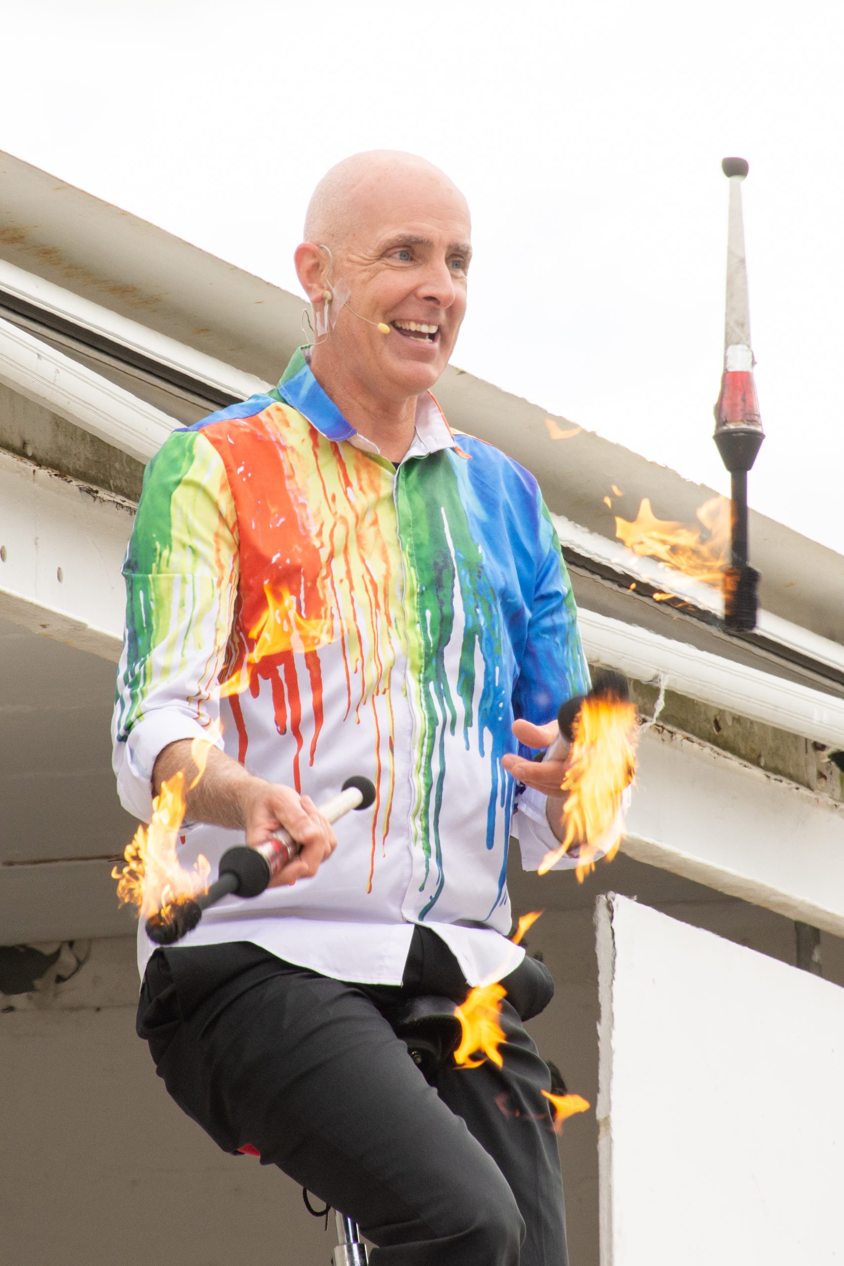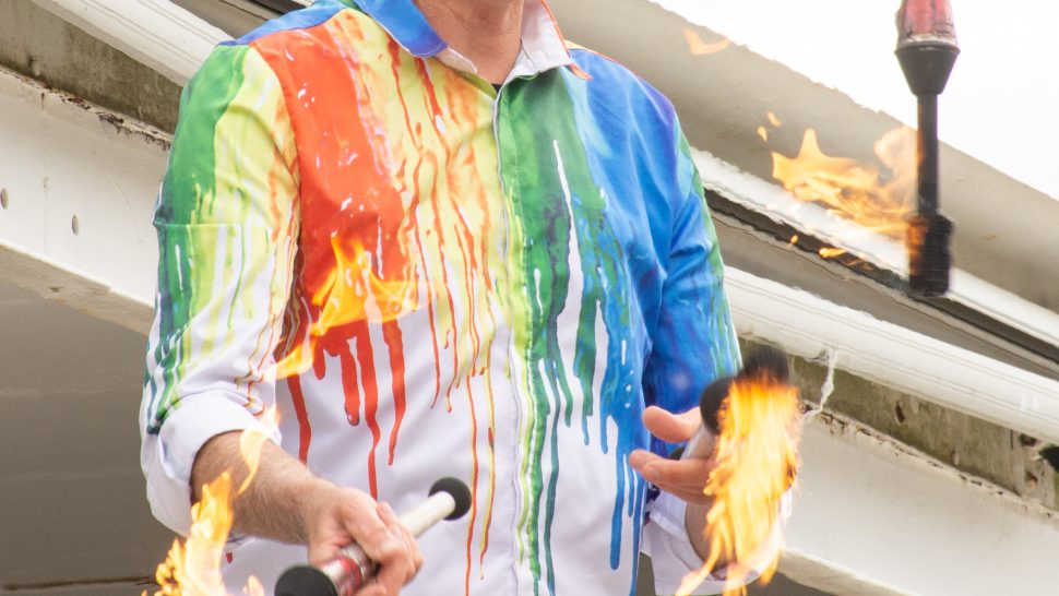 Not far past the fair’s main entrance, Bob Cates of Comedy in Motion juggled knives and flaming torches while seated on a unicycle.