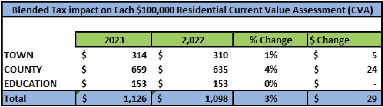 The blended rate - including the county’s 57 cents on each dollar, and education’s 16 cents - means a 2.63% increase year-over-year. Practically, that means a taxpayer with a home valued at $600,000, based on current value assessment, will be taxed around $6,756 this year.