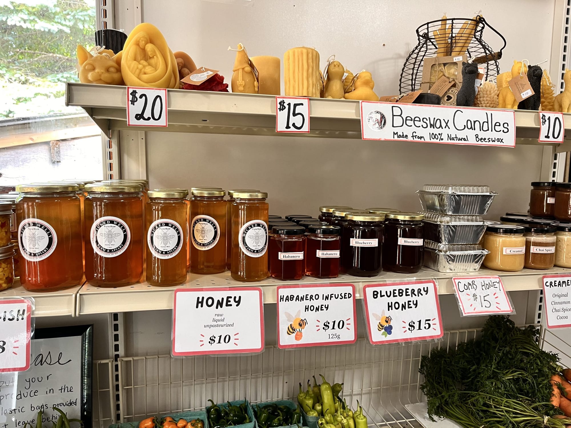 Inside the Wicked Welly Farm and Apiary on site store where visitors can purchase farm-grown and homemade products such as fresh vegetables, homemade jams, raw honey, whipped honey, flavoured honey, baked goods, lamb chops, pickles salsa. The farm features its own vegetable garden, mini apple and plum orchard as well as a few cherry trees. Visitors can purchase items from the farm until December when they close for four months, opening again in April.