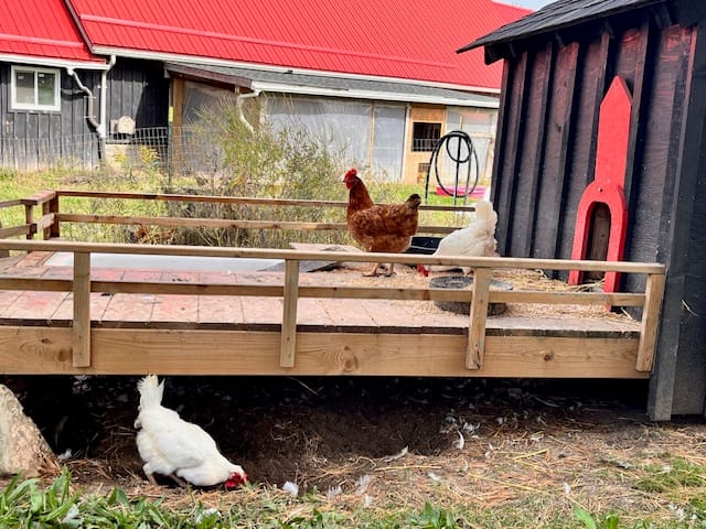 Chickens scratching at the ground in their coop.