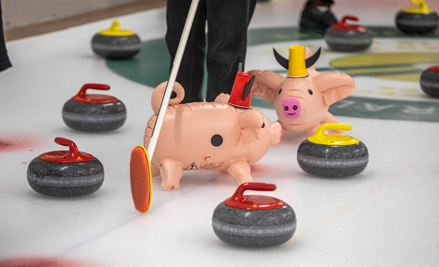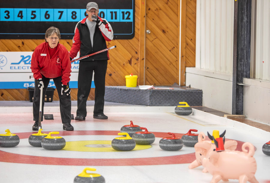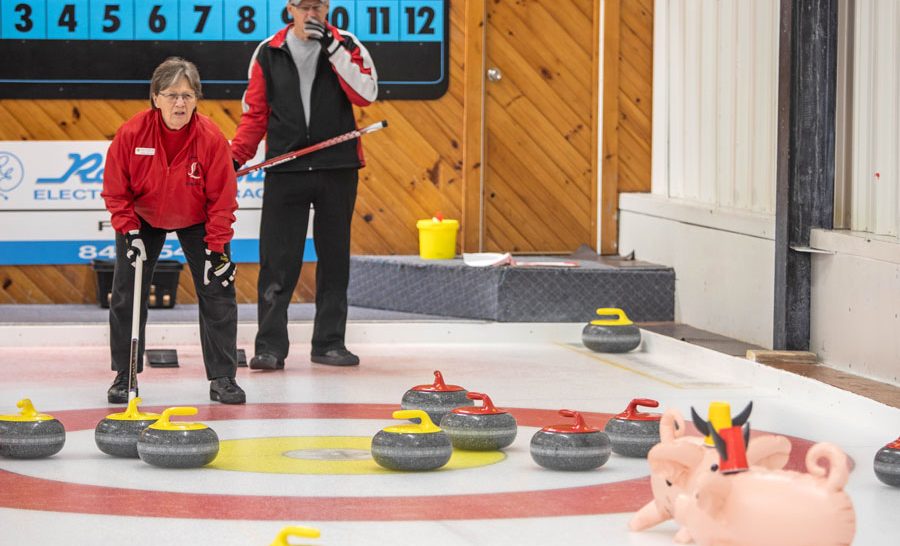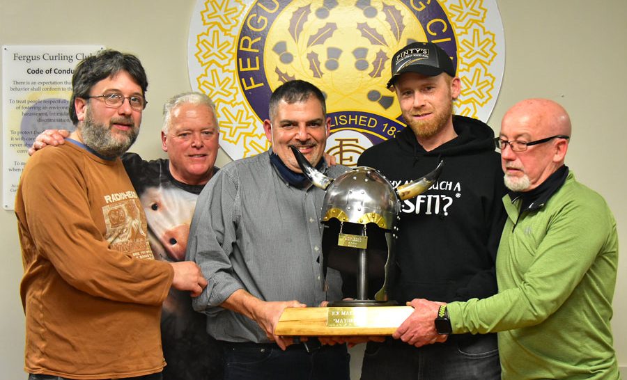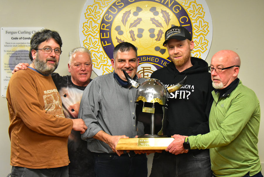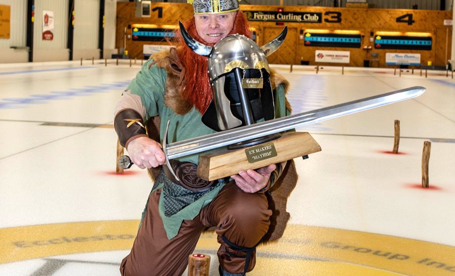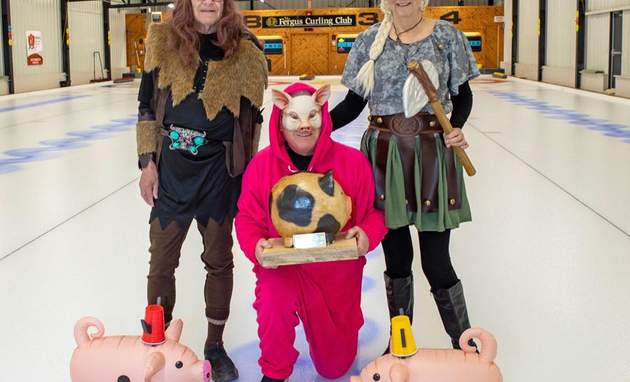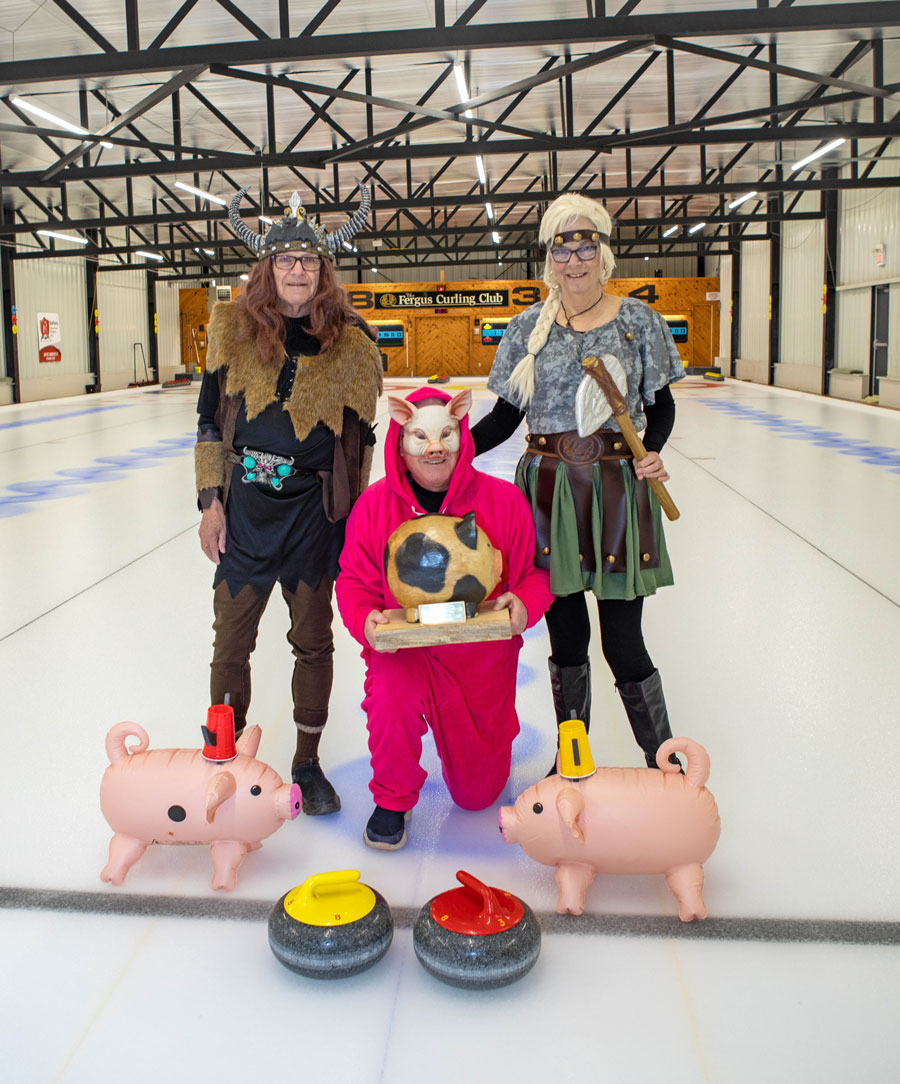 Mayhem on ice – The Fergus Curling Club saw a little mayhem recently, some pigs and even a few Vikings at its last game of the season. There were lots of piggies to knock down, sticks to throw stones at and a chance to win a prize for the best costume. The ice making crew created the game called “1834Kurlkoob” for the Ice Makers Mayhem Bonspiel. Chief ice maker Andy Maine holds paraphernalia and the Ice Makers Mayhem trophy.