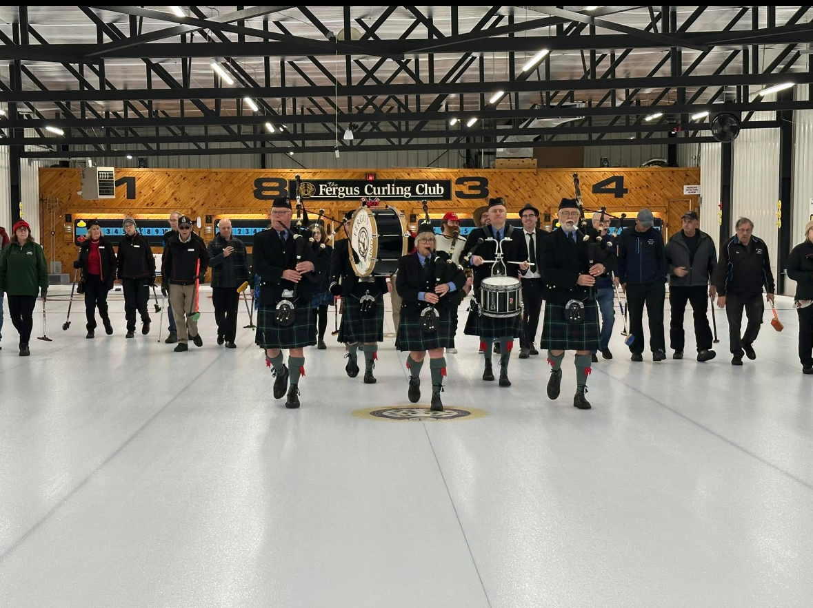 The Fergus Pipe Band, with two Black family members in the band, welcomed curlers onto the ice. Senator Black’s father Bert was also present.