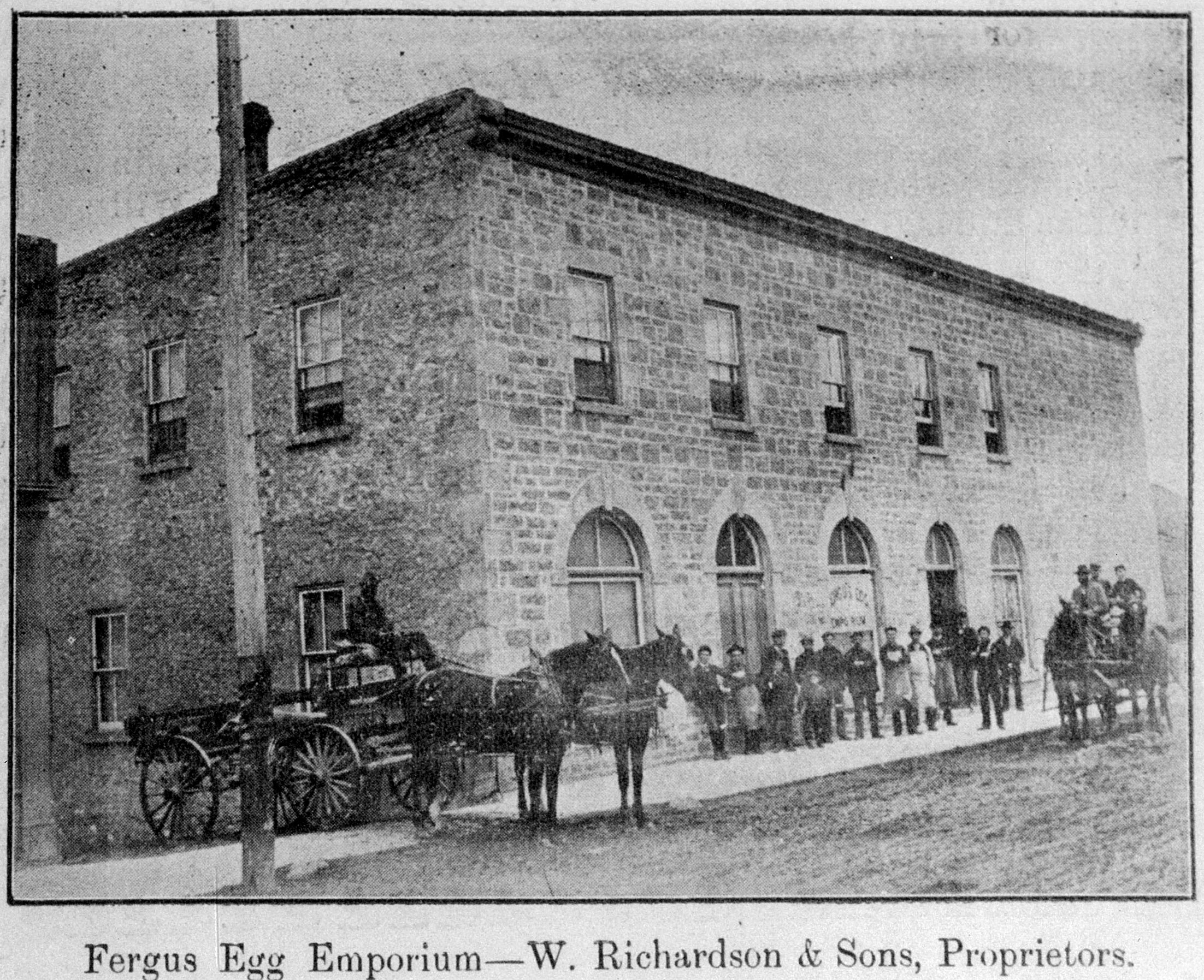 During the peak of the season in the spring Richardson candled 6,000 dozen eggs each day, checking for imperfections, and grading according to size. The west end of the building (which now houses the Fergus Tandoori Grill) contained cold-storage facilities. Richardson preferred to store a portion of the eggs and ship them by the carload late in the season to get the best price.