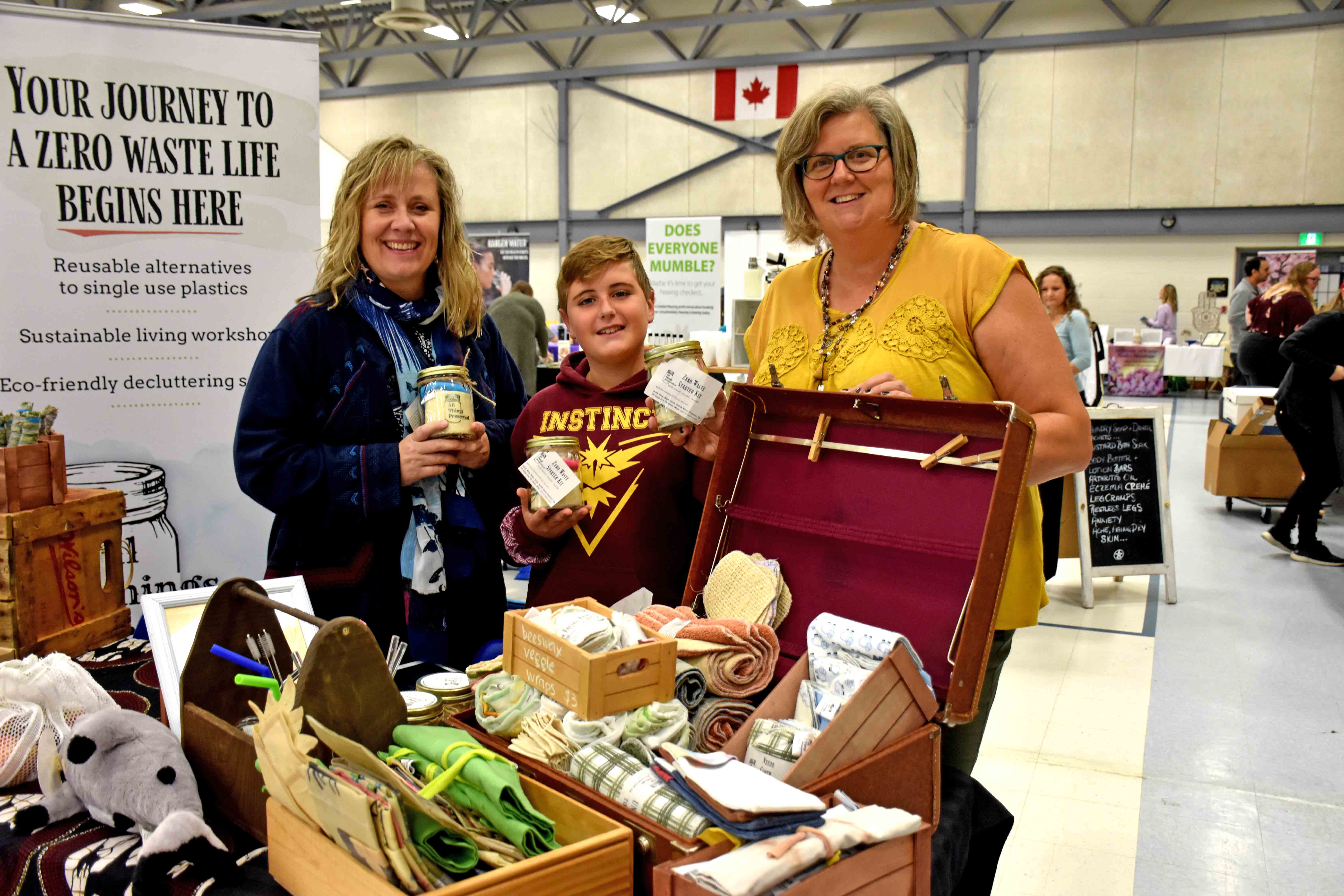PHOTO ONE: All Things Preserved – Susan Gentilcore, Oliver Sequin and Shannon Cunninghton offer a quick trip to a zero-waste life. The Kitchener-based company showcases handmade items that are refashioned, reclaimed, repurposed and/or reinvented, and they all support a zero-waste lifestyle. The business was one of many at the Fergus Health and Wellness Expo at the Fergus sportsplex on Oct. 20. PHOTO TWO: Enoch Seed Company – Thomas Sanders and Jamie Noseworthy showcased 33 of the Fergus-based business’ exclusive varieties of specialized heirloom and unique seeds at the Health and Wellness Expo. Photos by Mike Robinson
