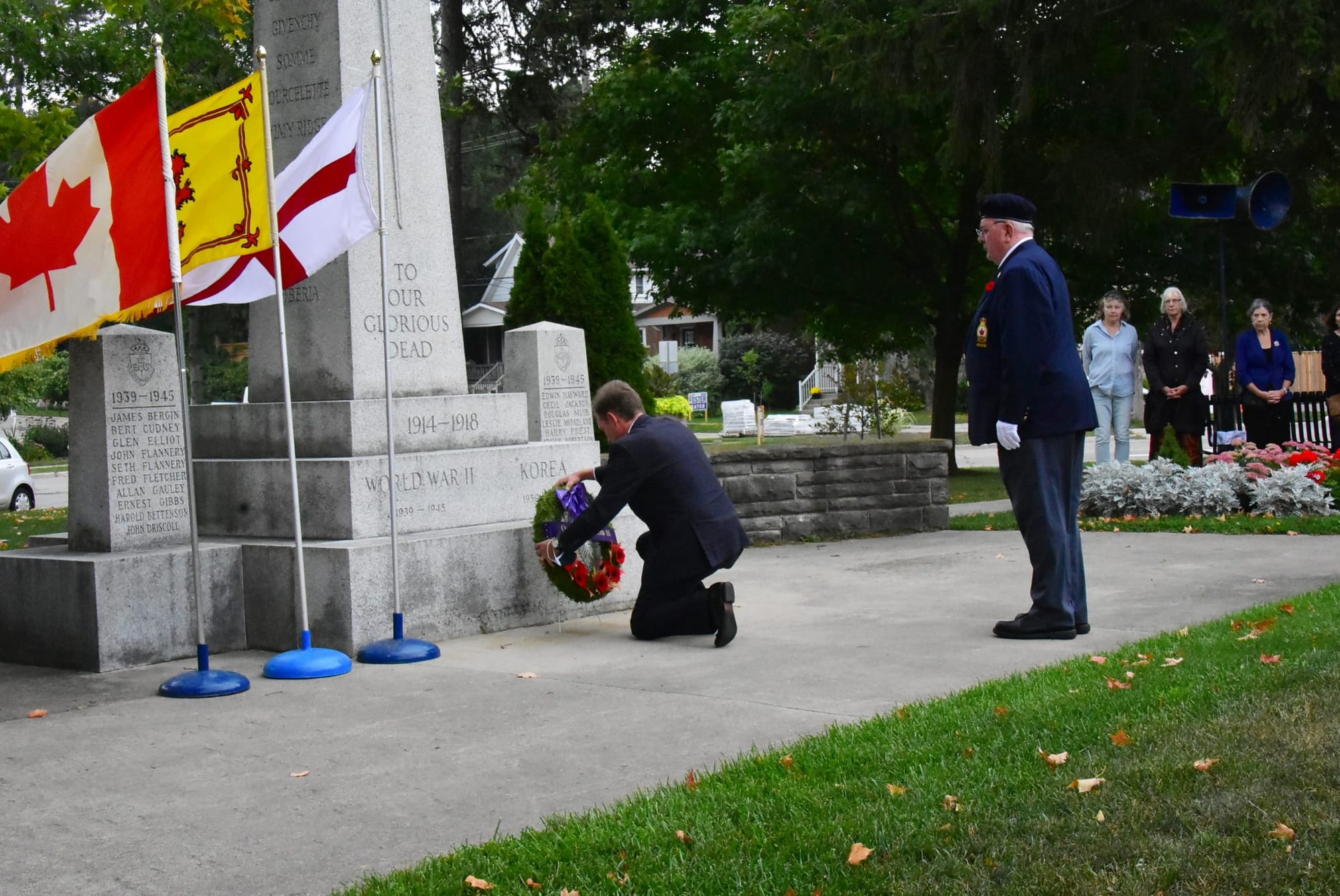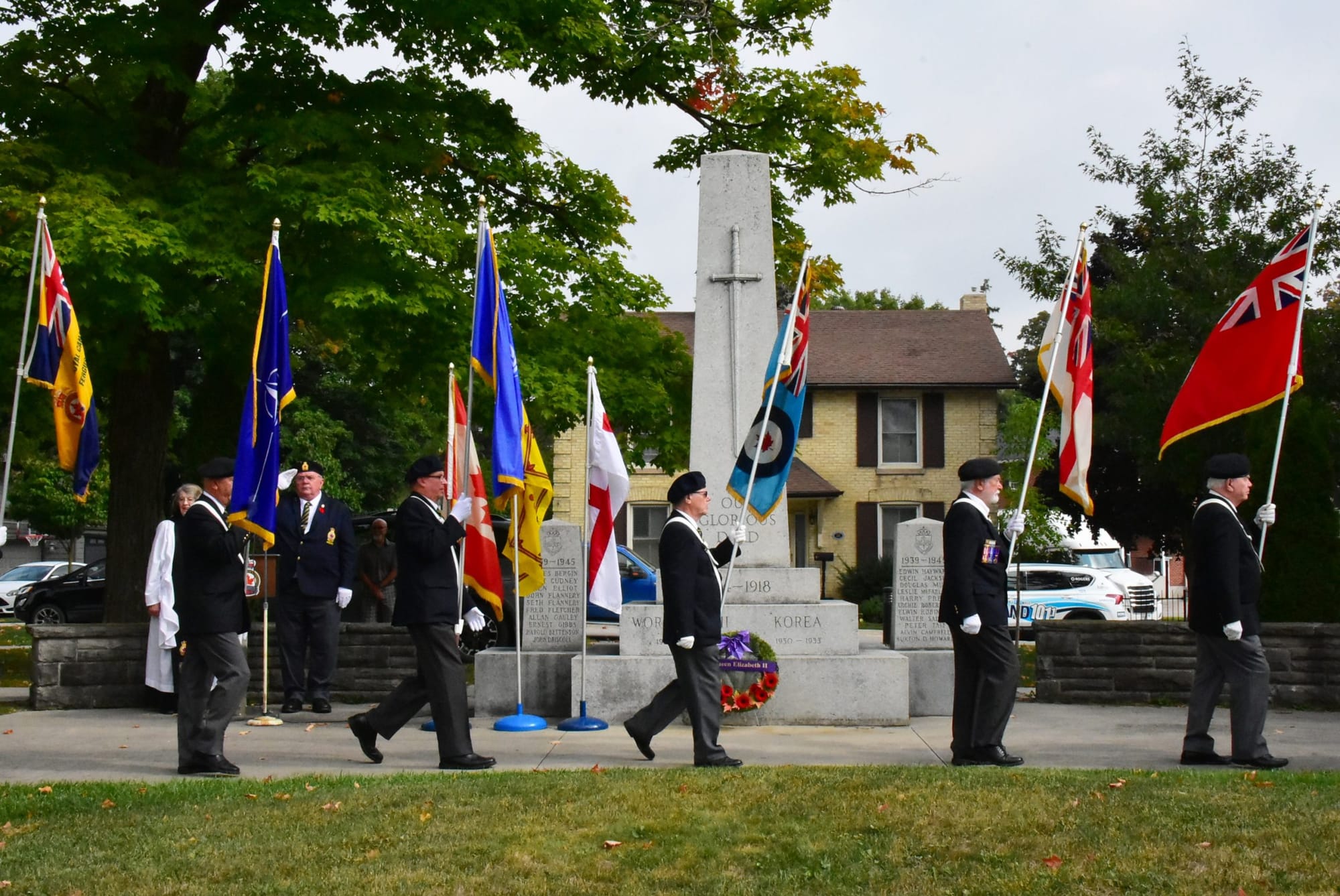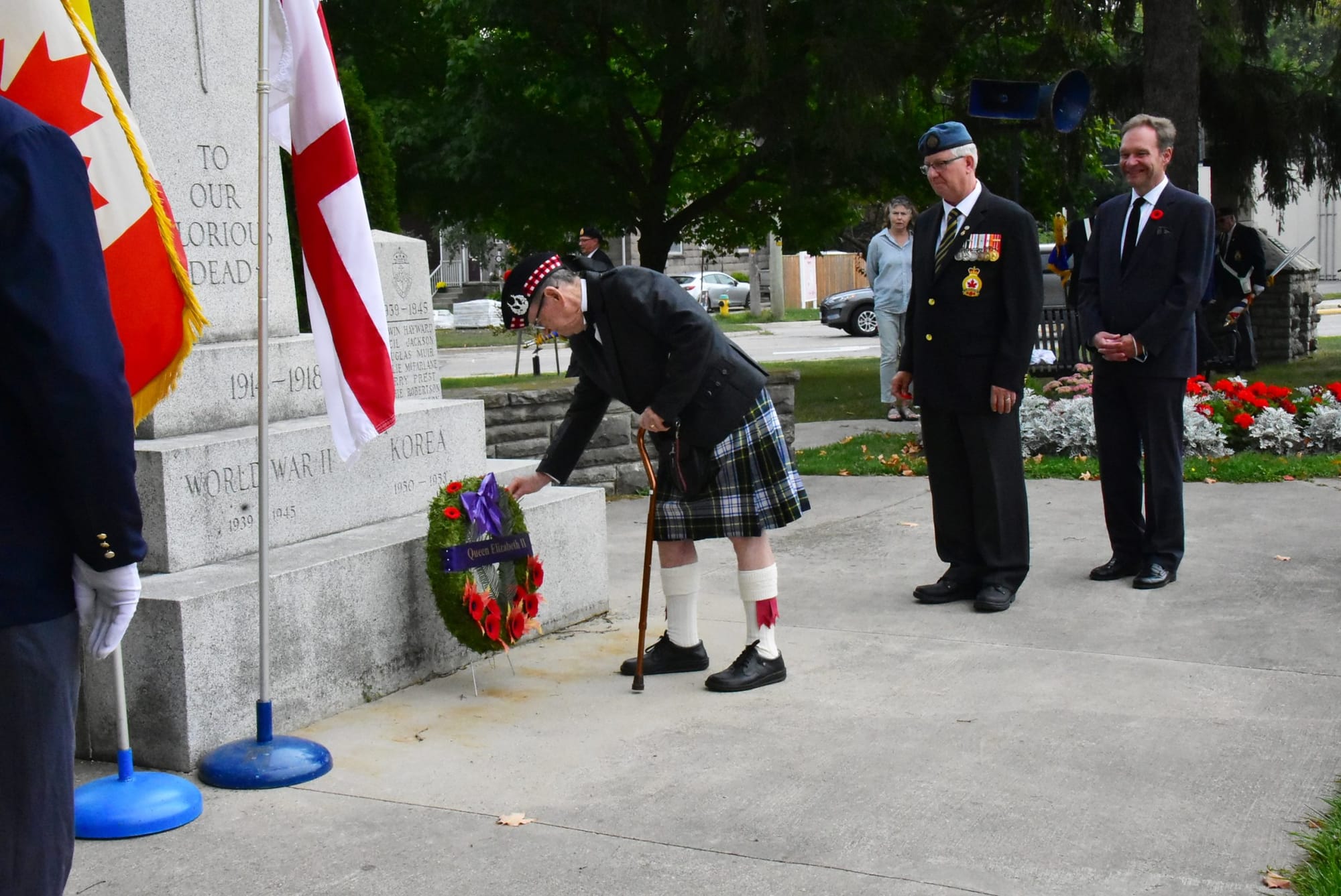 Wellington-Halton Hills MPP Ted Arnott lays a wreath on behalf of the provincial government as Legion President Brian Bielby looks on. Photos by Bill LongshawThe Fergus Legion Colour Party passes by the cenotaph to honour the Queen on Sept. 19.Valentine Glen, who served with the Gordon Highlanders under appointed Colonel-in-Chief Prince Charles (now king), was among those to place a poppy on a wreath at the end of the Sept. 19 ceremony at the Fergus cenotaph in memory of Queen Elizabeth II.