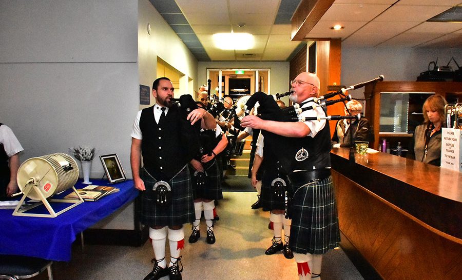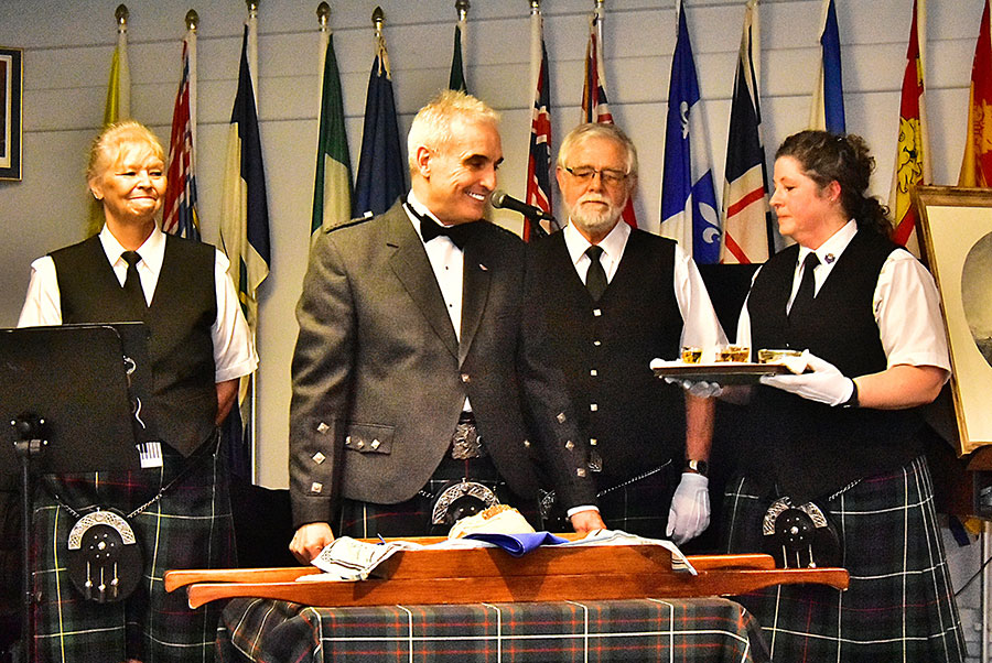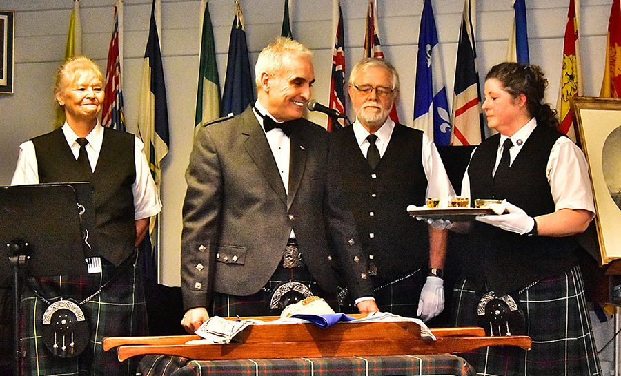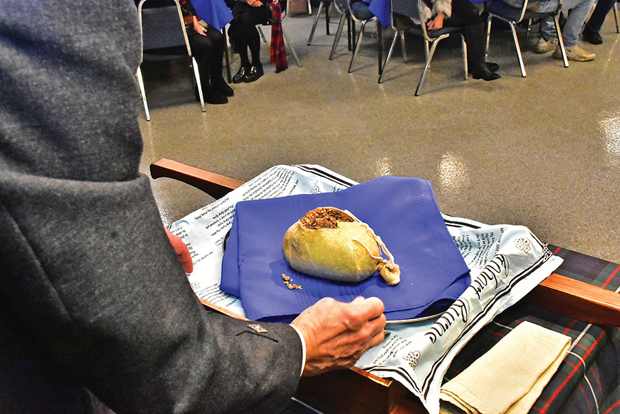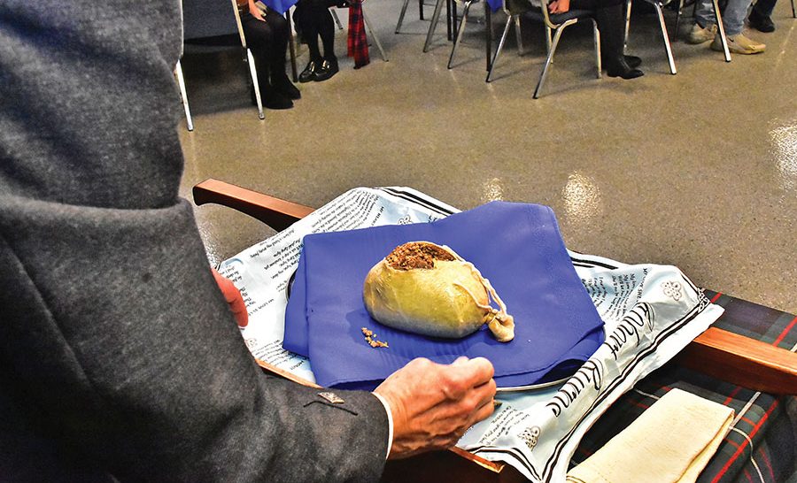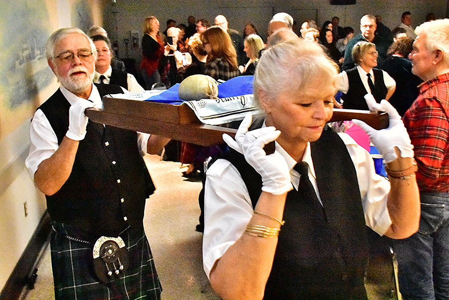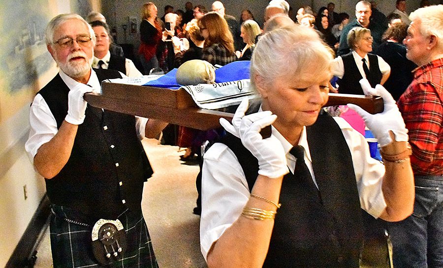 Burns returns – The spirit of Robbie Burns came to life once again when the Fergus Pipe Band presented Robbie Burns Night on Jan. 21 at the Fergus Legion hall. A good crowd of over 160 enjoyed the evening with a few new twists this year under the direction of new pipe major Mark Cripps. Bringing in the haggis are David and Mary-Ann Tinsley.
