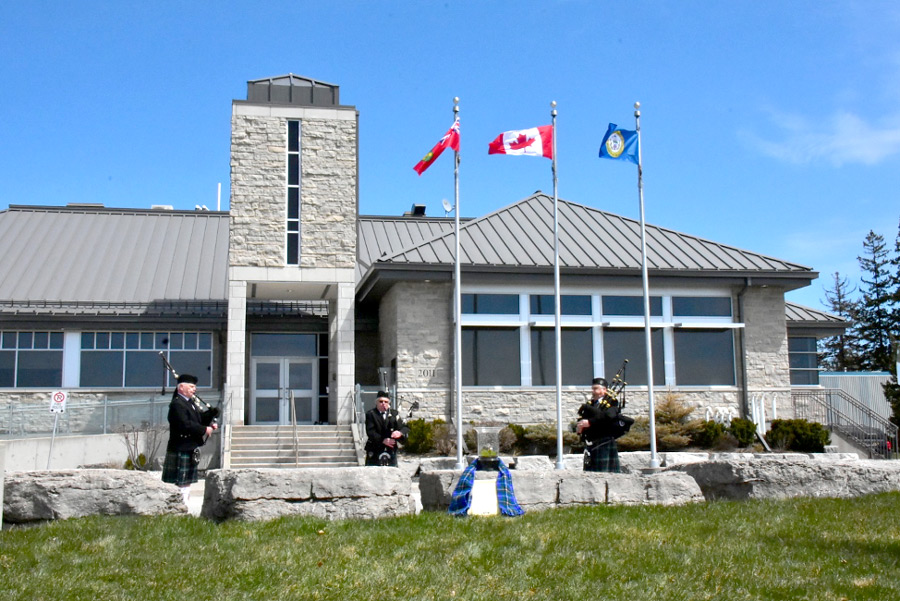 Pipe band tribute – On April 25 Fergus Pipe Band members Mark Cripps, Murray Young (pipe major) and Mike McMorris gathered in front of the OPP station in Aboyne to pay their respects to those who died in the mass shooting in Nova Scotia on April 18 and 19. There were other members at the cenotaph in Fergus and singly at other points in Elora and Waterloo.