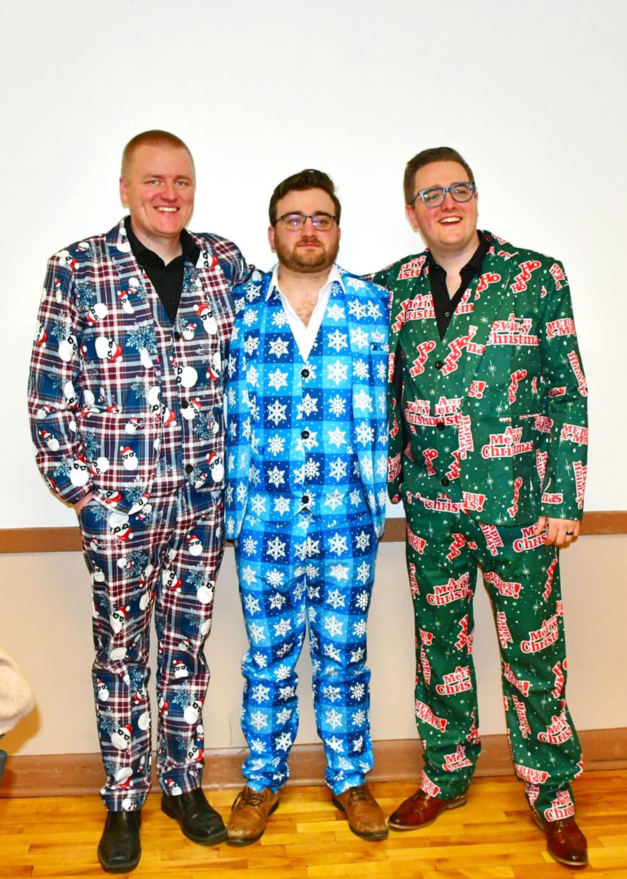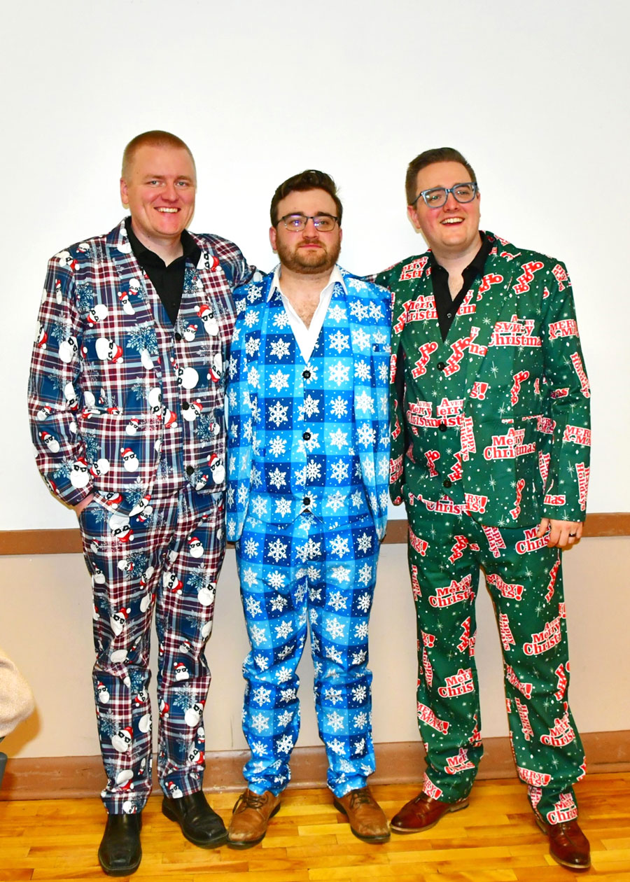 Pipe band drummers, from left, Tayler Black and his brothers Adam and Michael dressed for the season in festive three-piece suits for the Christmas party.