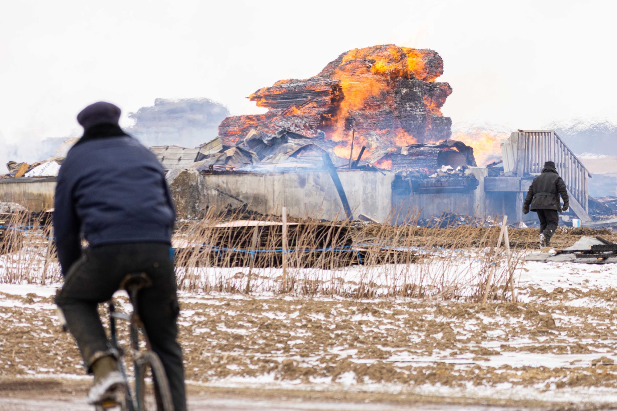 Stacks of wood were still burning onThursday afternoon as heavy wind fanned the flames and carried smoke from the ruins across snow-covered fields.