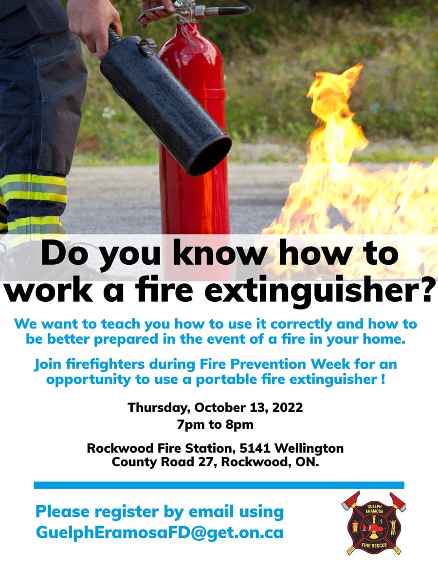 To help make people comfortable with basic fire safety measures, the Guelph/Eramosa department will be hosting a portable extinguisher hands-on training event for the community on Oct. 13 from 7 to 8pm at the Rockwood Fire Station.