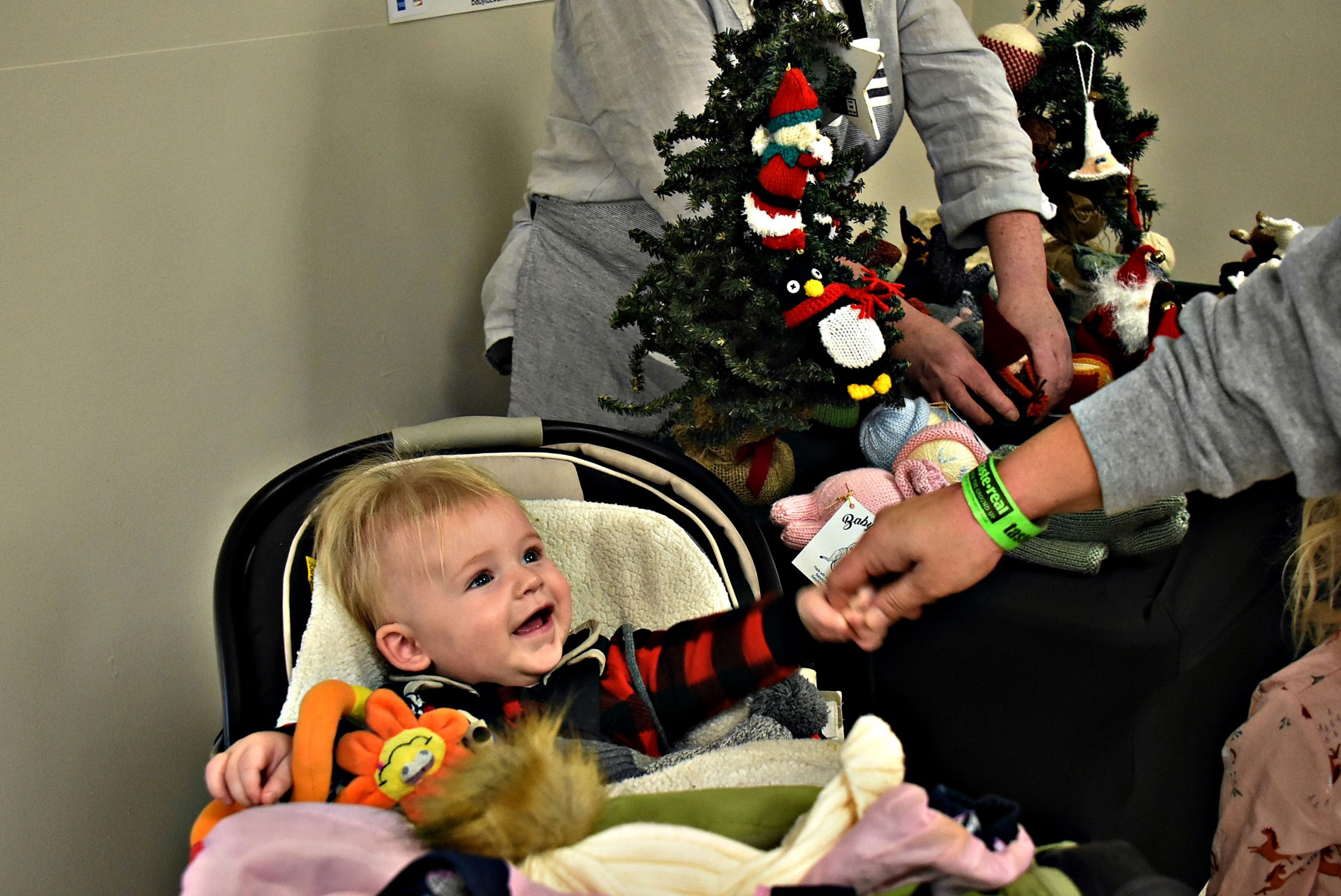 Happy Kip Hammond from Ariss selects a knitted Teddy bear from a booth and business called “Baby It’s Ewe.”