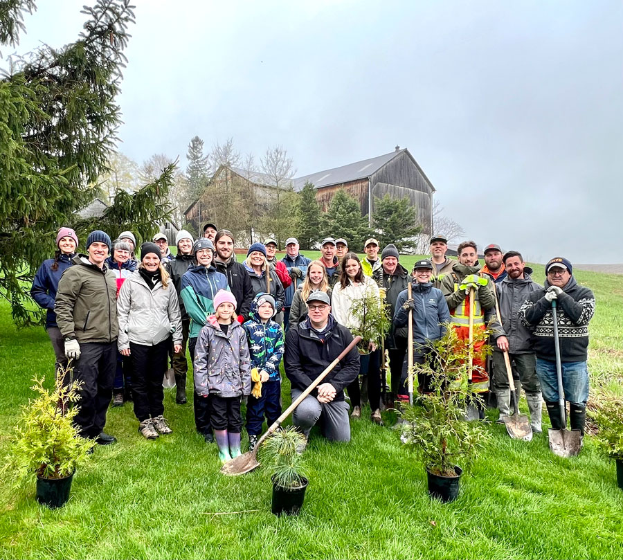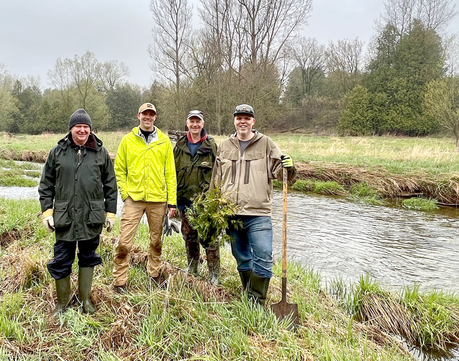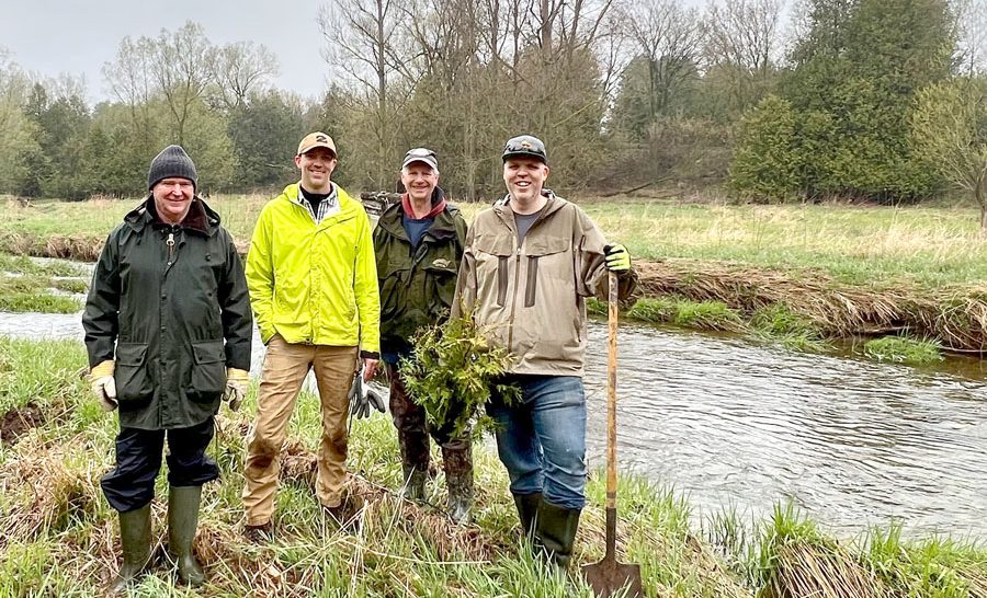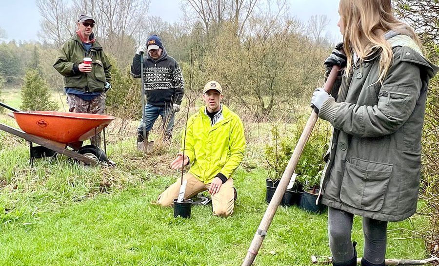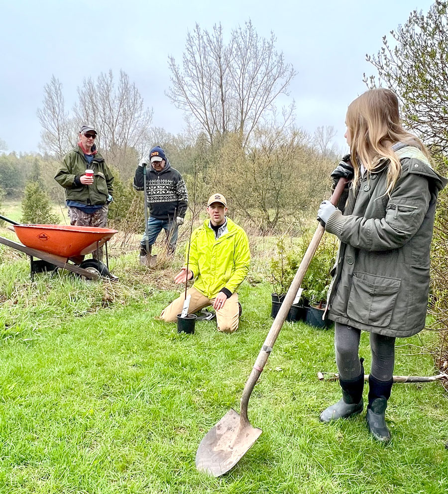 Grand planting – It was 8C and wet on May 1 on the banks of the Carroll Creek near Elora, perfect tree planting weather for the many volunteers who turned up to assist the Friends of the Grand River. The trees will eventually shade and cool the waters of the stream for brown trout and other species. Eastern white cedar, sugar maple, paper birch, and burr oak were among the species planted by the enthusiastic volunteers who ranged in age from five and up. The volunteer planting crew. Friends of the Grand River board members Keith Halbert, Brad Knarr and Rob Voisin with tree planting advisor Tyler Bredschneider, second from right. Bredschneider offers advice to the tree planters.