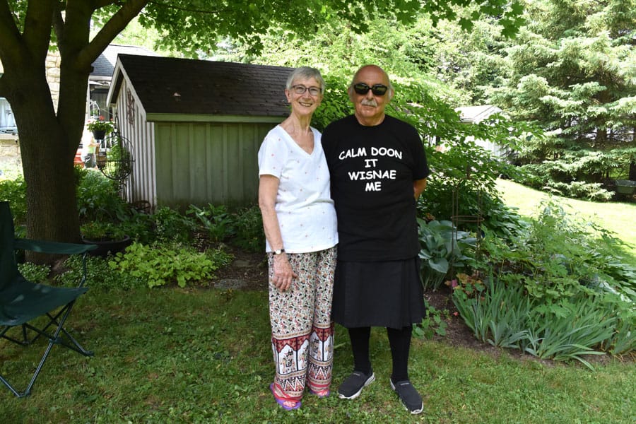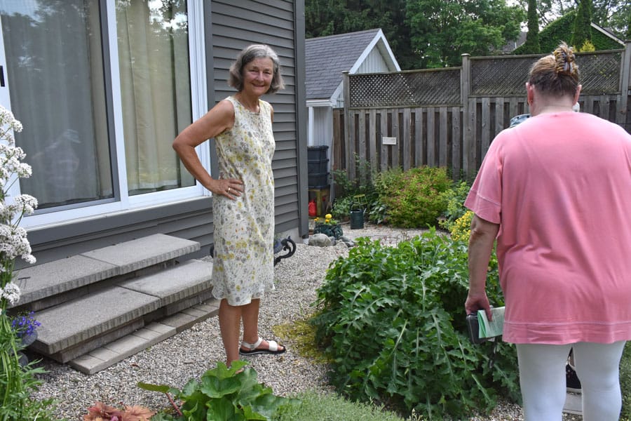 Homeowners Jennifer and Patrick Otto opened their garden gate for the Fergus Horticultural Society’s garden tour on June 22. Jennifer, shown here, says she battles black walnut trees, that add toxins to the soil, but it appears she’s winning the battle with raised beds and clever self-watering techniques.