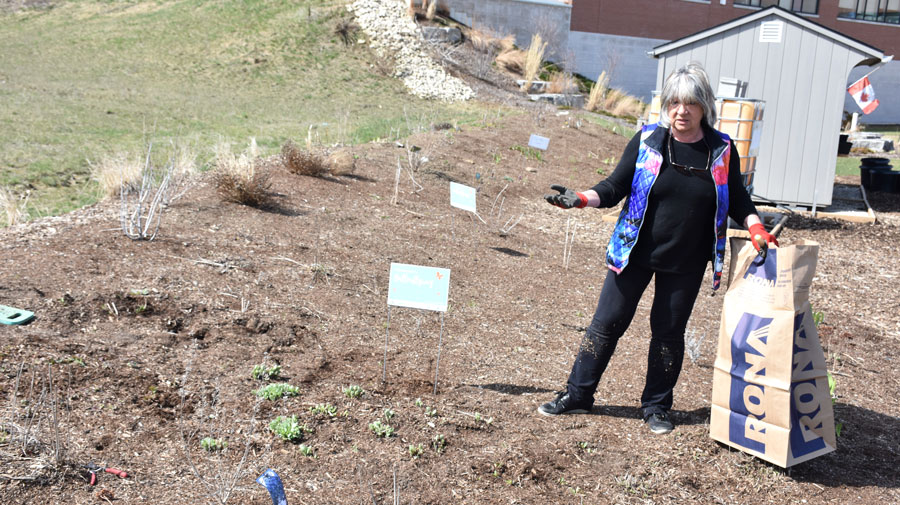Julanta Chalas was working her patch of garden on April 29 and said society members took plants from their own gardens for the hospital, “so it will look mature pretty fast,” she said.