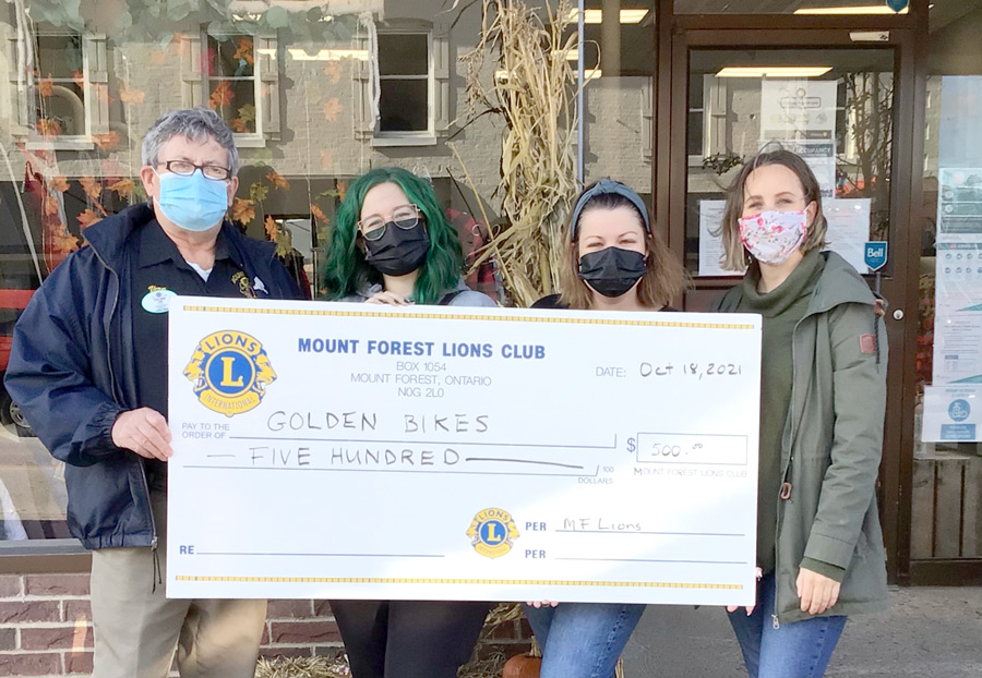 President Vern Job of the Mount Forest Lions Club presented local BIA/Downtown Mount Forest representatives with a cheque for $500 for their Gold Bikes campaign. Sara Corfield, Amanda Boylan and Kayla Morton commented on the great response they got from the community for this worthy cause. The Childhood Cancer Awareness Month campaign is raising funds for the family of Simon Edgar-Dickert, a local youth battling brain cancer, as well as some other local families and Ronald McDonald House. Submitted photo