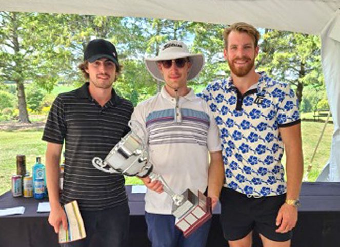 Neil Dunsmore, Jeff Hoffman and Paul Shepperd appear pretty pleased the Cody Shepperd Memorial Golf Tournament raised $20,000 for The Grove Youth Hubs. Submitted photo