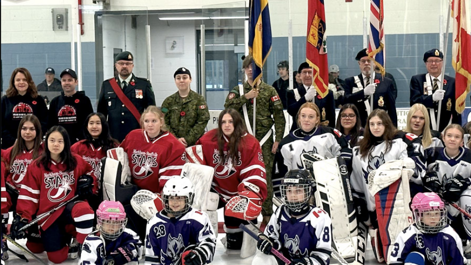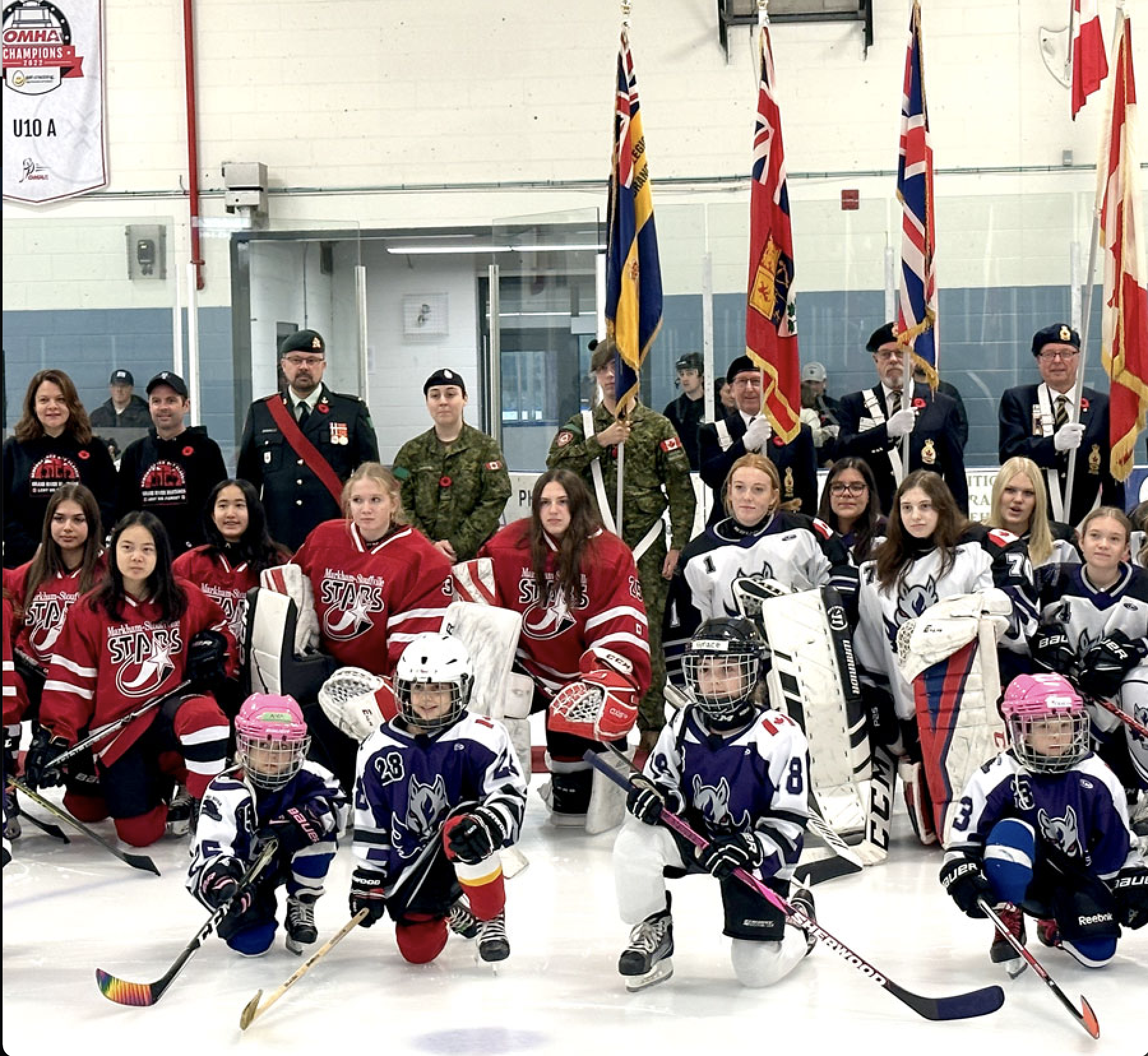 FERGUS – The Grand River Mustangs Remembrance Day Classic tournament was held at the Centre Wellington Community Sportsplex in Fergus on Nov. 4. Games involving 60 teams were played at rinks in communities around the area including Fergus, Drayton, Arthur and Grand Valley. Some of those in attendance were tournament officials, players, legion members, teachers, and Canadian Forces Reserves.