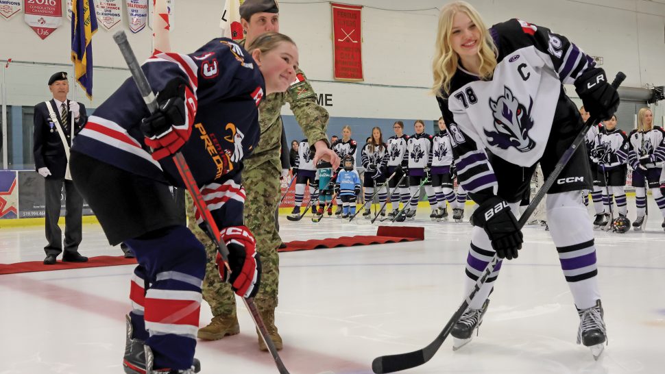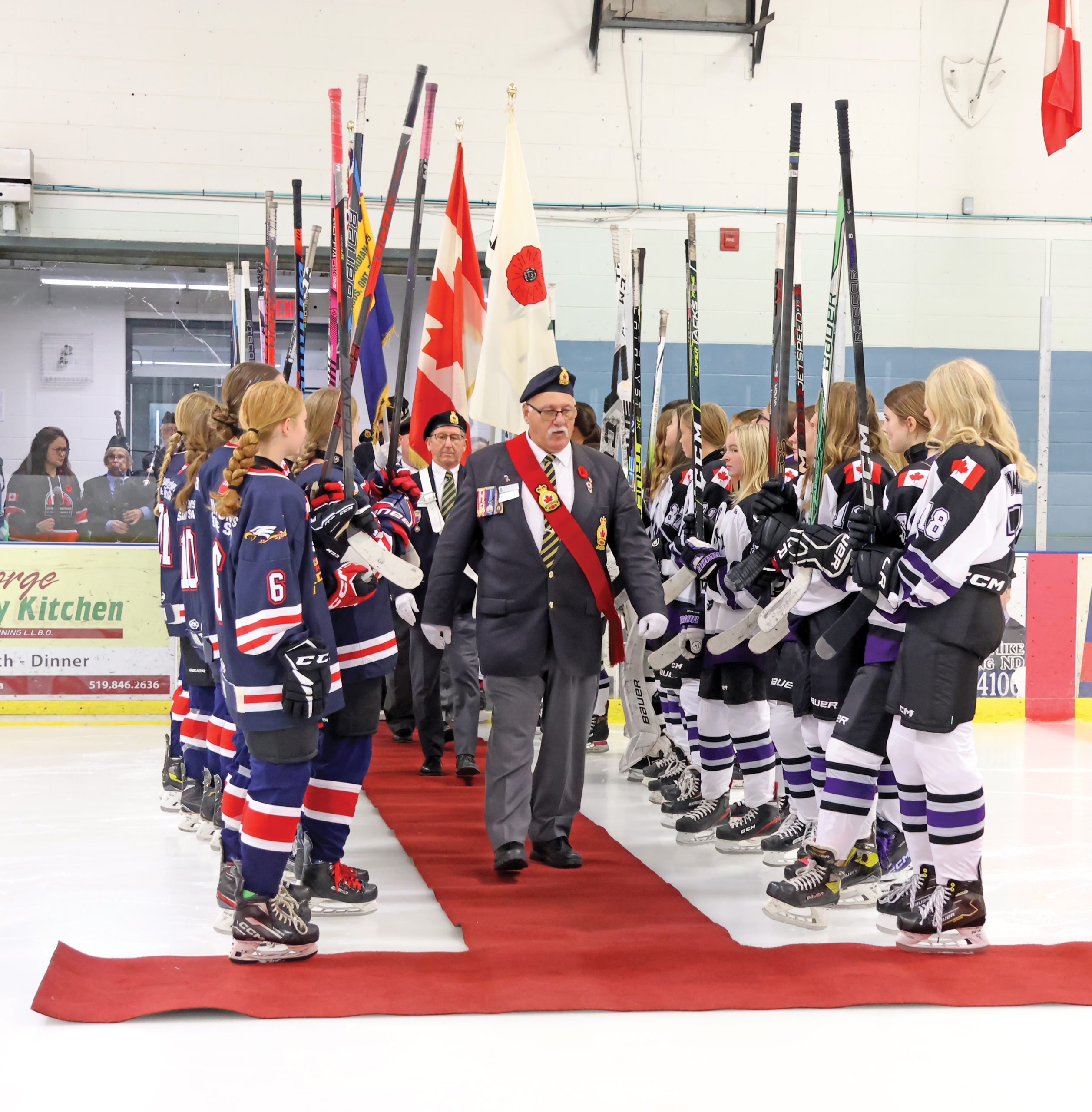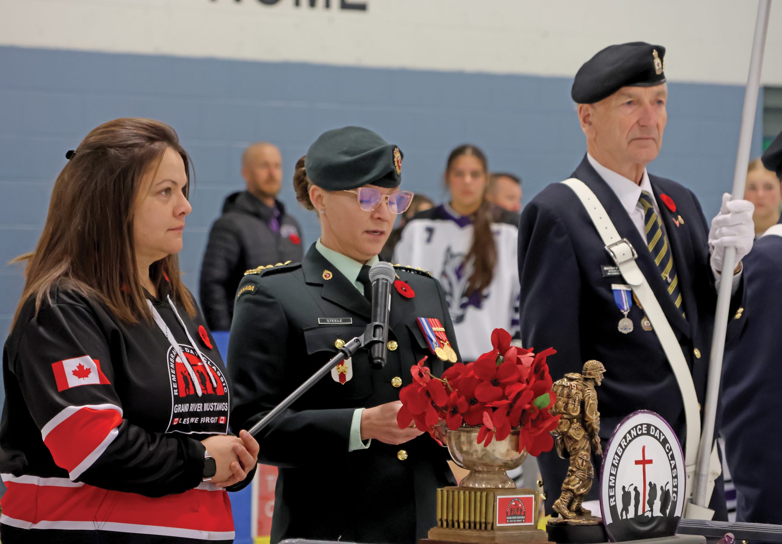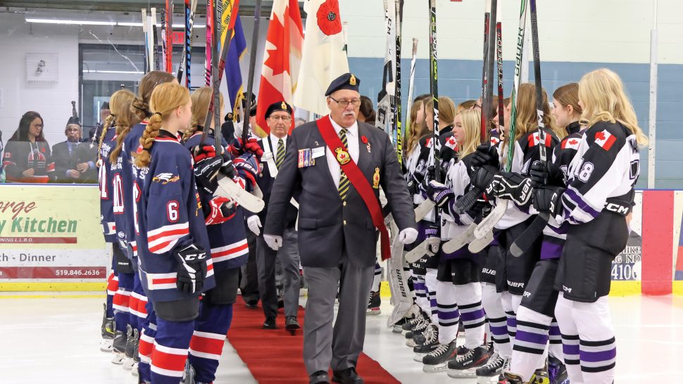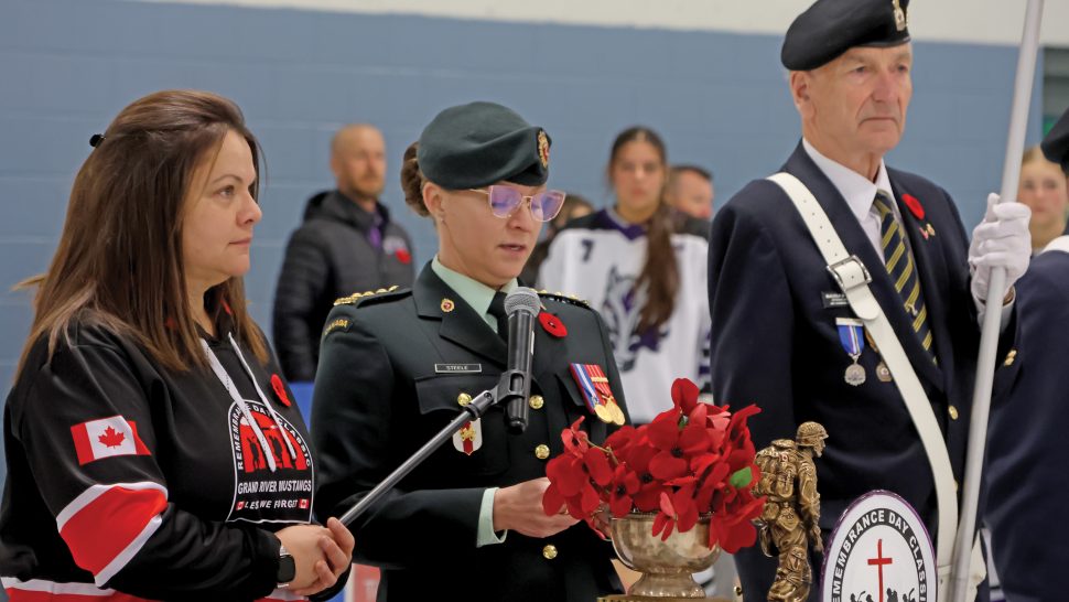 FERGUS – The Grand River Mustangs hosted their sixth annual Remembrance Day Classic hockey tournament from Nov. 8 to 10 in Fergus. The tournament included a special ceremony in advance of the Saturday, Nov. 9 11am game featuring local Legion members and members of the Canadian Forces.