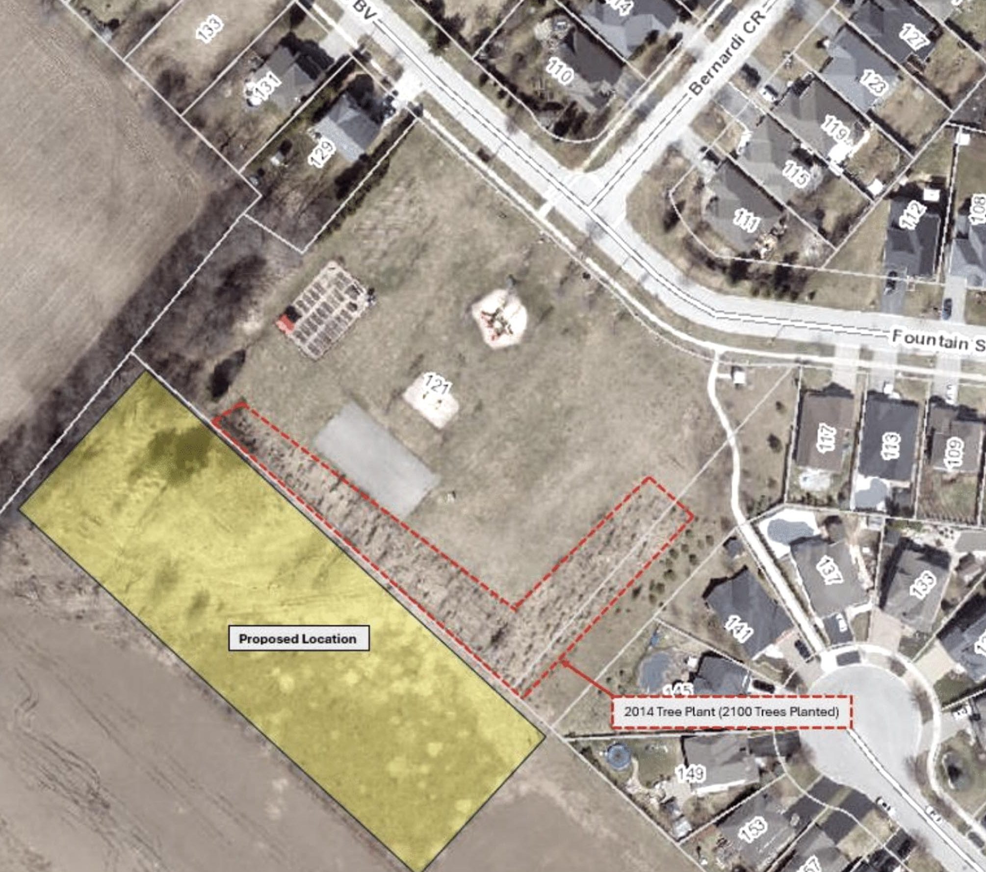 The proposed site for this year’s Warden’s Tree Planting event is seen here in yellow. Photo from council agenda