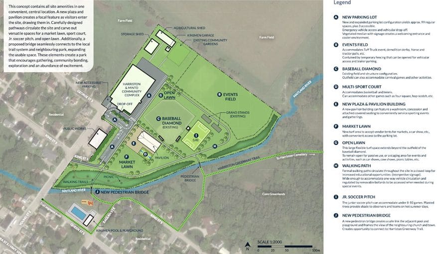 The preferred concept for the Harriston Arena and Fairgrounds Master Plan was developed through consultations between town staff and the Harriston Kinsmen Club, Harriston-Minto Agricultural Society, Harriston and District Horticultural Society, Maitland Valley Conservation Authority and local minor sports groups.
