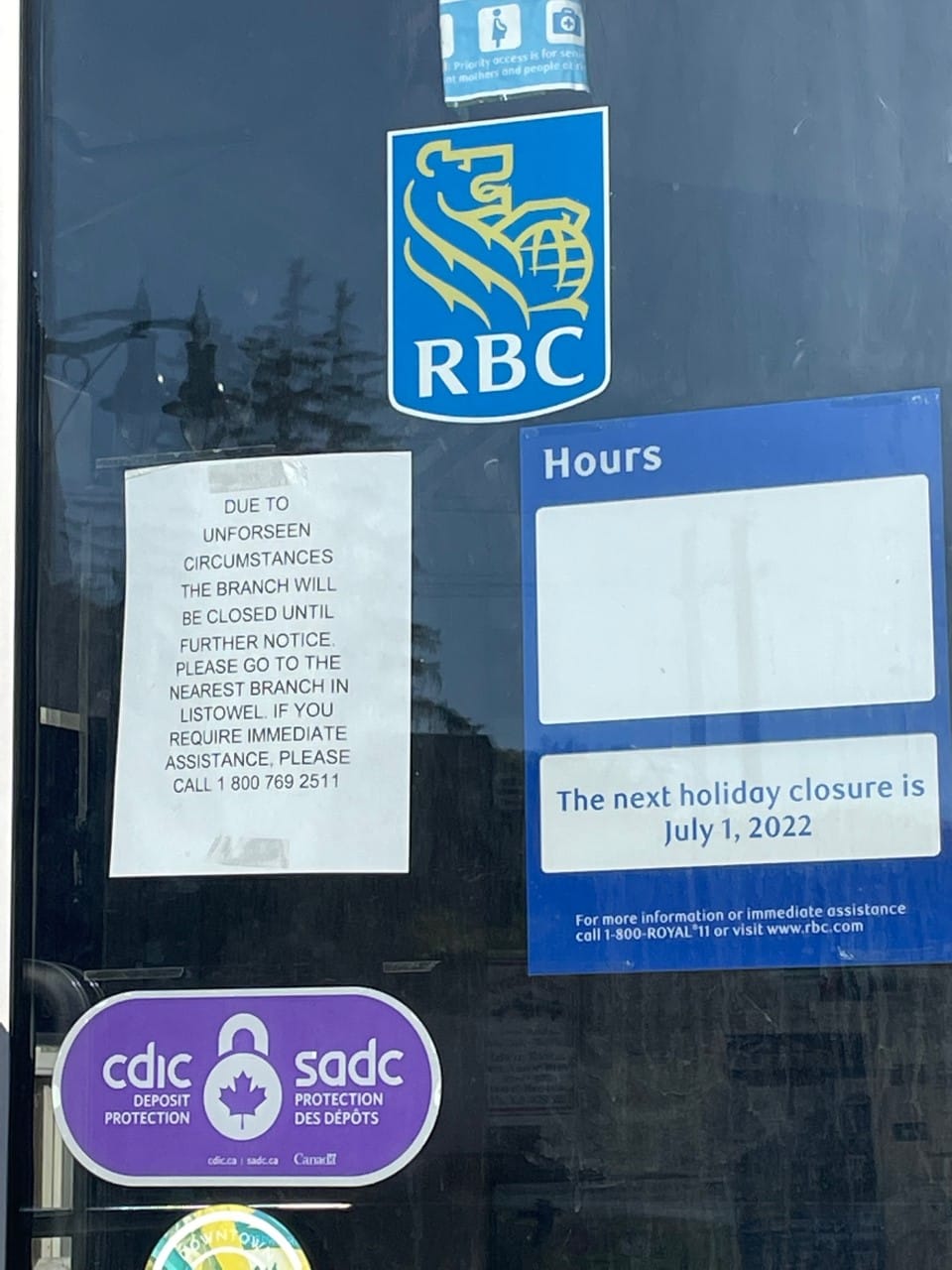 The note directs clients to the branch in nearby Listowel and provides a number to call for immediate assistance.