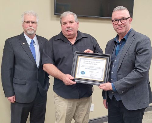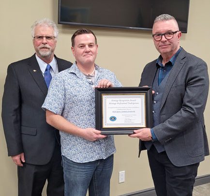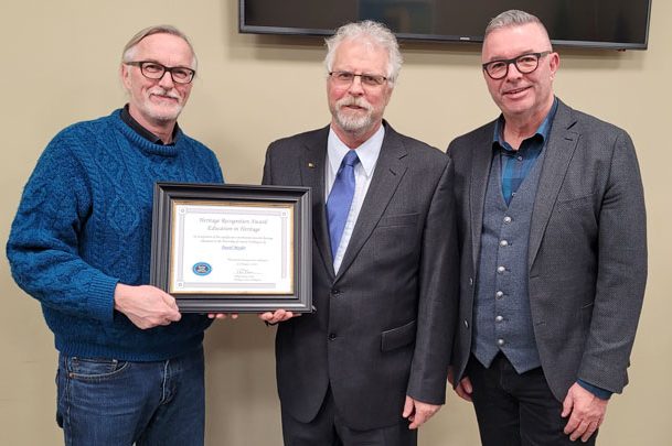 David Meyler, left, accepted his award on behalf of he and his brother Peter Meyler, who could not attend. Presenting the award were Heritage Centre Wellington chair Philip Brown and Mayor Shawn Watters. Submitted photo