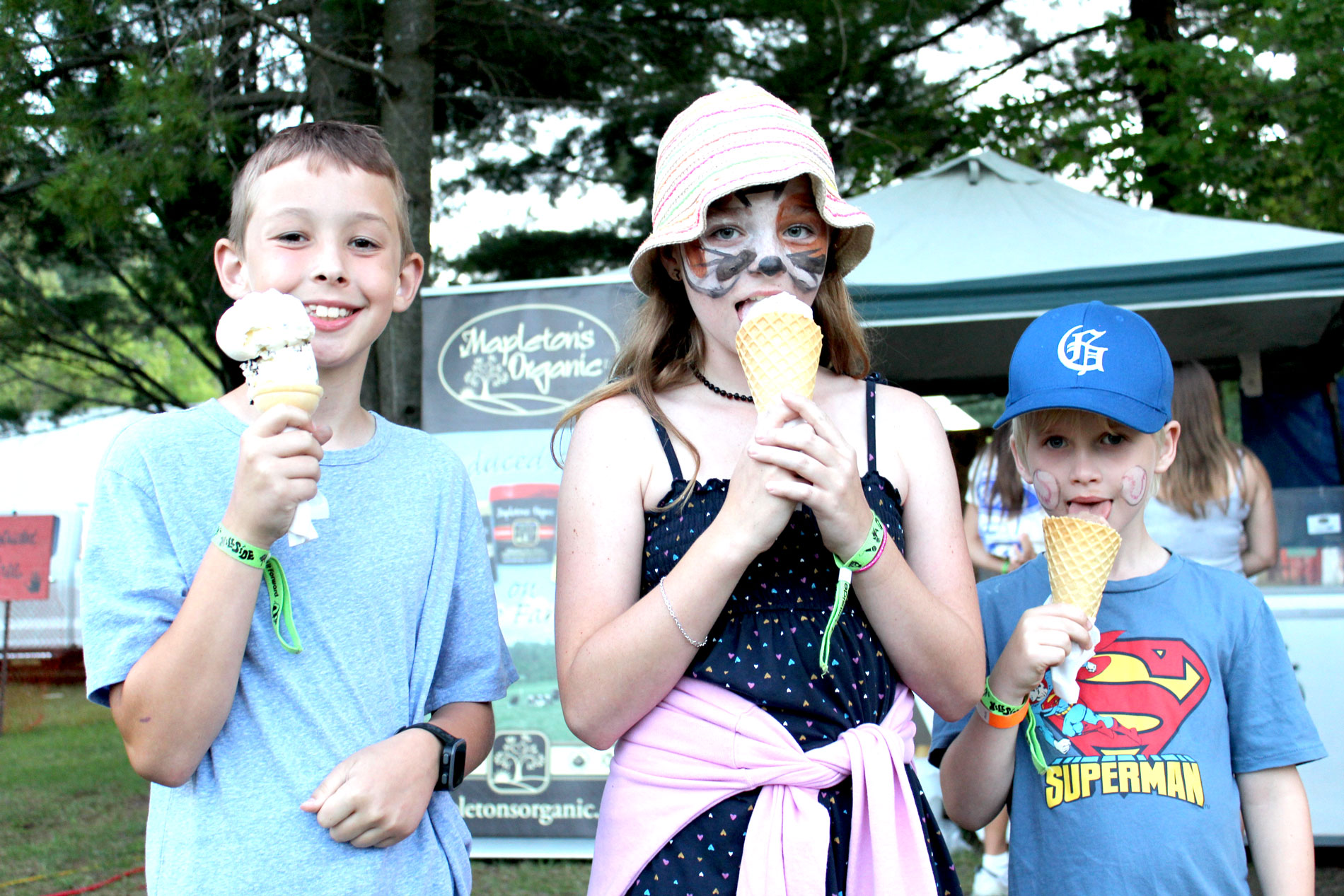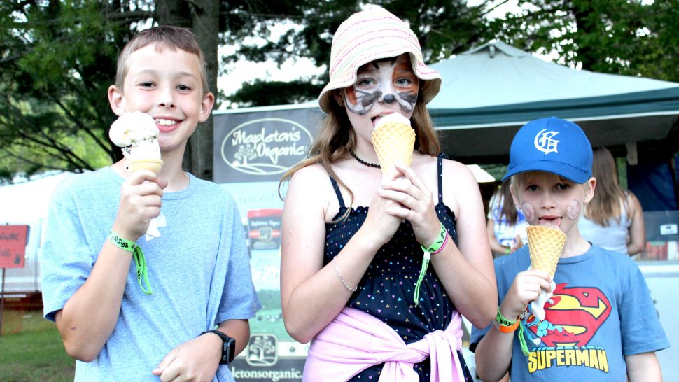From left, Ollie Darnell, Corinne Cooper and Connor Minogue enjoy some ice cream from Mapleton’s Organic Dairy Farm at Hillside on July 19.
