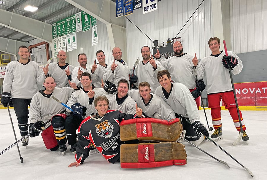 The Wellington Warriors were the last team standing at the end of the tournament. From left: back, Clyde Diefenbacher, Dave Shantz, Gary Freeman, Josh Brubacher, Kendrick Frey, Wayne Martin, Javan Martin, and Tyler Martin; centre, Ryan Bearinger, Travis Bowman, Colin Bauman, Troy Gingrich, and Ethan Horst; front, goaltender Nick Martin.