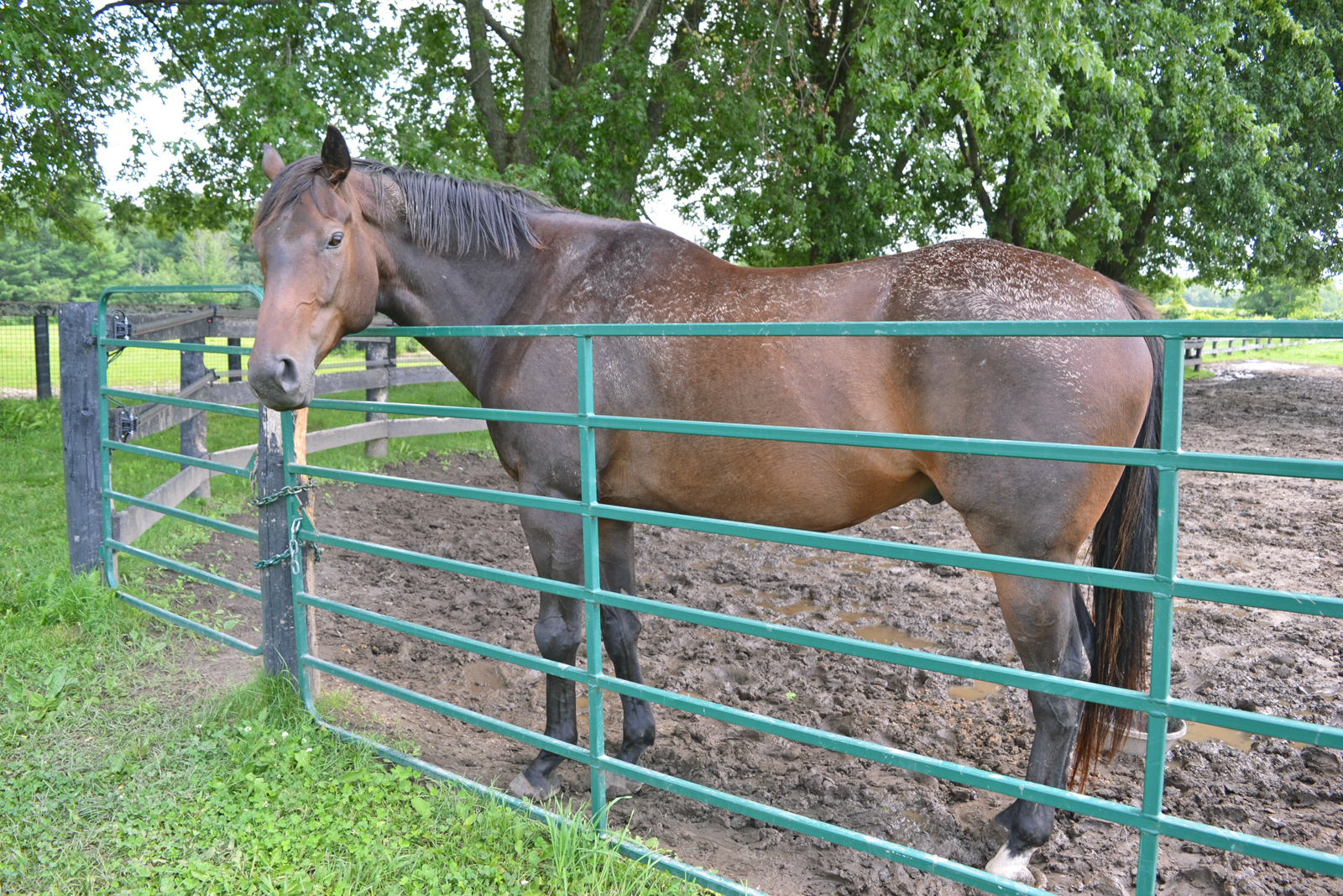 See the signs – Reading a horse’s body language by looking at the position of its ears, head and tail, as well as observing its muzzle and eyes, can tell you a lot about how the horse is feeling. Both thoroughbreds above are retired race horses currently living at the LongRun Thoroughbred Retirement Society farm in Erin. Photos by Lorie Black