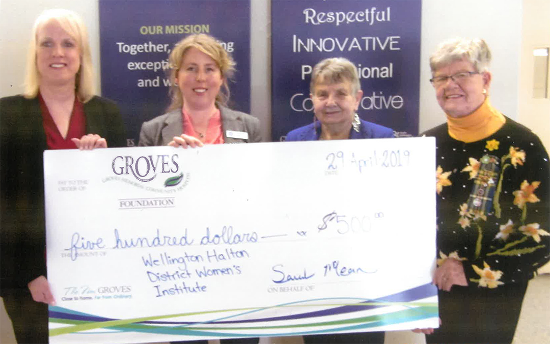 The Halton District Women’s Institute presented the Groves Hospital Foundation in Fergus with a donation of $500. Foundation executive director Lori Arsenault, left, accepted the cheque from past president Sarah Mclean and members Cindi Rabstein and Pat Salter. Submitted photo