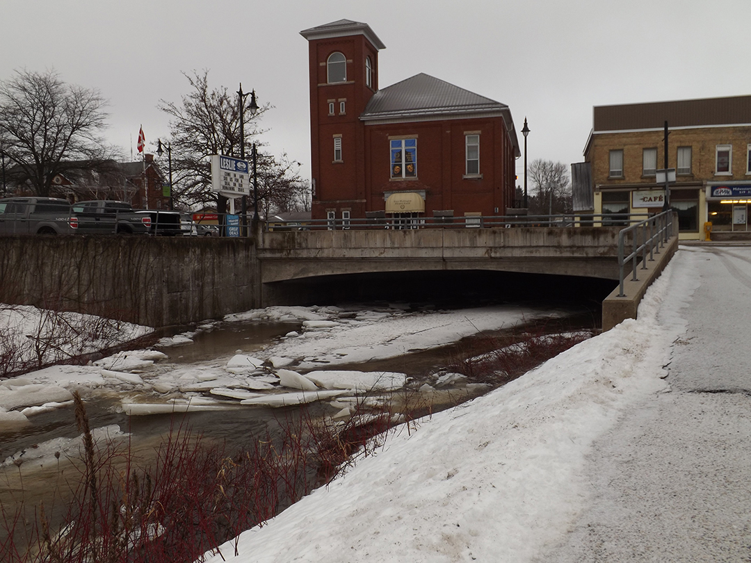 Maitland Conservation issued a watershed conditions safety statement after mild temperatures and heavy rainfall on Feb. 4 raised levels in local streams and rivers. Flows were expected to remain high until later in the week. The authority also warned of the potential for ice jams, primarily in the lower Maitland River, although ice was collecting near the Elora Street bridge in downtown Harriston Tuesday morning. The conservation authority is also reminding watershed residents to stay away from creeks, rivers and other watercourses.                                                                                   Photo by Patrick Raftis