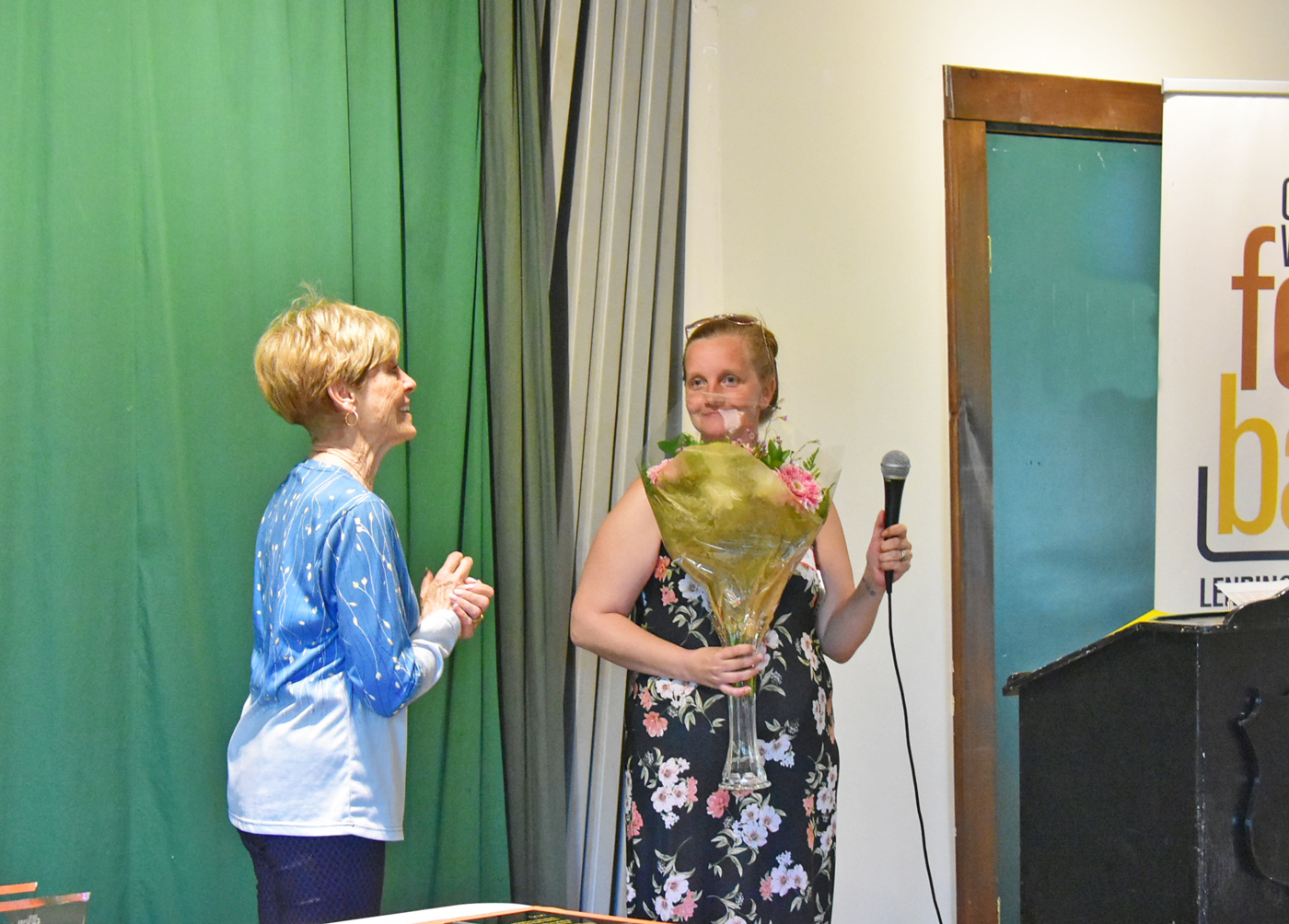 Food bank chair Jackie Andrews offers thanks and flowers to guest speaker and food bank client Evelyn Seeley. Photo by Bill Longshaw