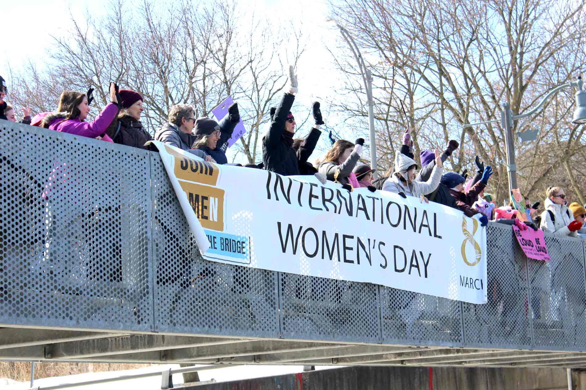 Participants kicked things off by gathering on Veterans Memorial Bridge and dropping a banner over the railing. Many cars passing under the bridge honked their horns in support after the banner dropped.