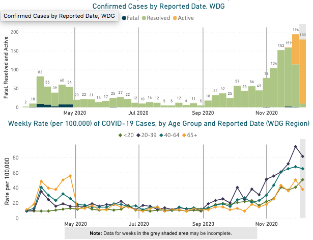 These graphs show trends in confirmed cases of COVID-19 in the WDGPH region since March. (WDGPH image, Dec. 11)