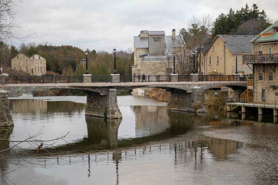 The bridge runs from West Mill Street, across from the Elora Mews, on the north side of the Grand River to Victoria Street on the south side.