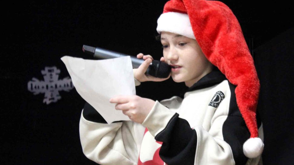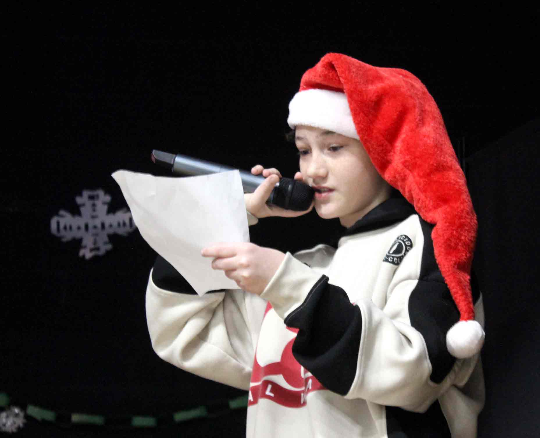 Students watched a video emphasizing the joy of giving and student Daniel Small, also known as “Paper Shredder,” made his way onto the stage with a mic in hand and Santa hat atop his head to perform an original rap song about the students’ generosity.