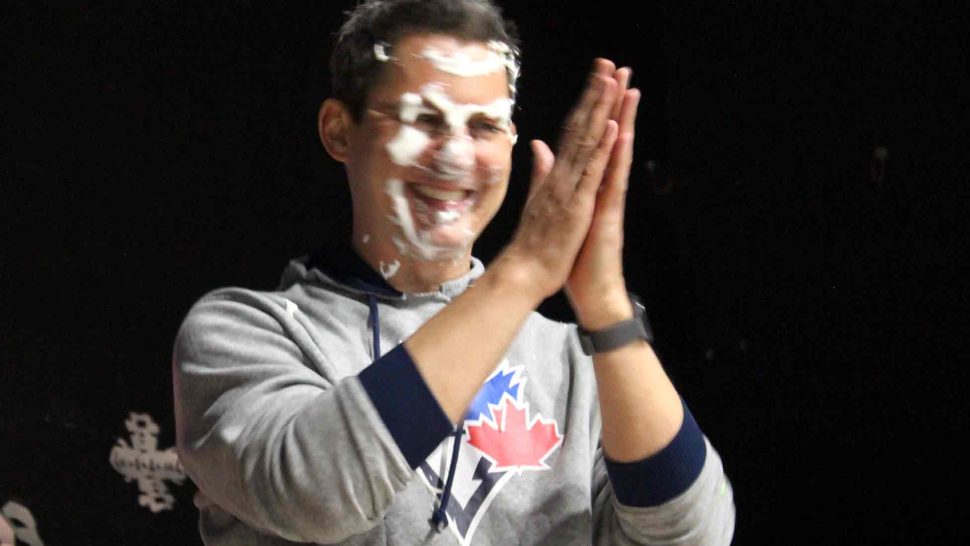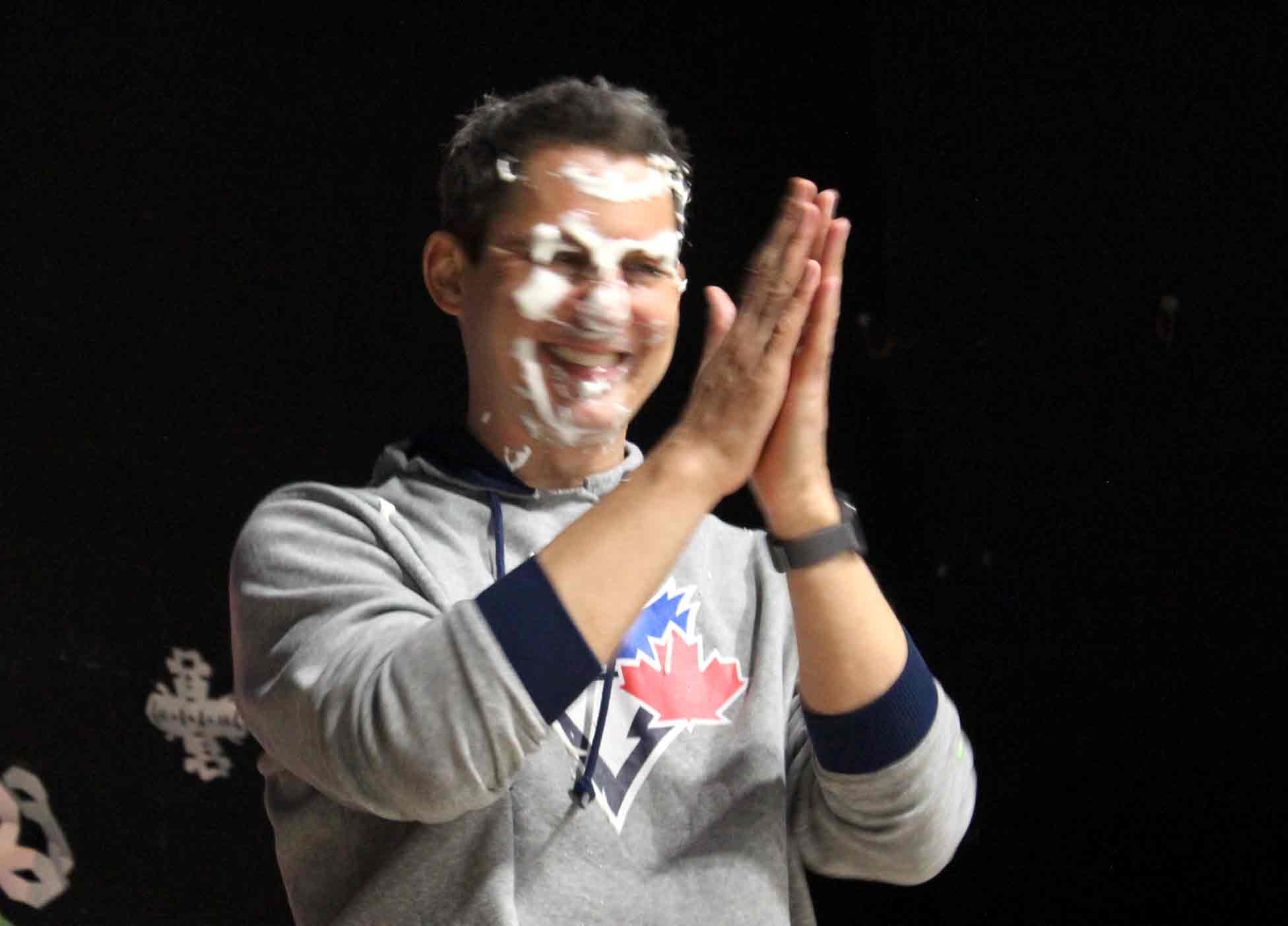 Students who made top contributions to the drive were honoured with very messy pies in the face, which had students laughing loudly.
