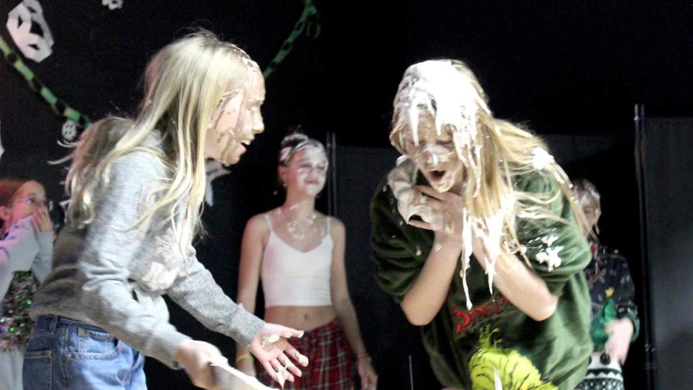 Gia Brodie looks shocked at the mess she made throwing a pie in Lily Tunney’s face. Photo by Robin George