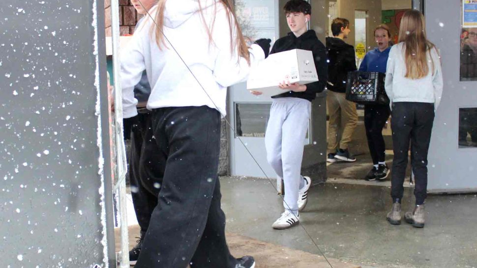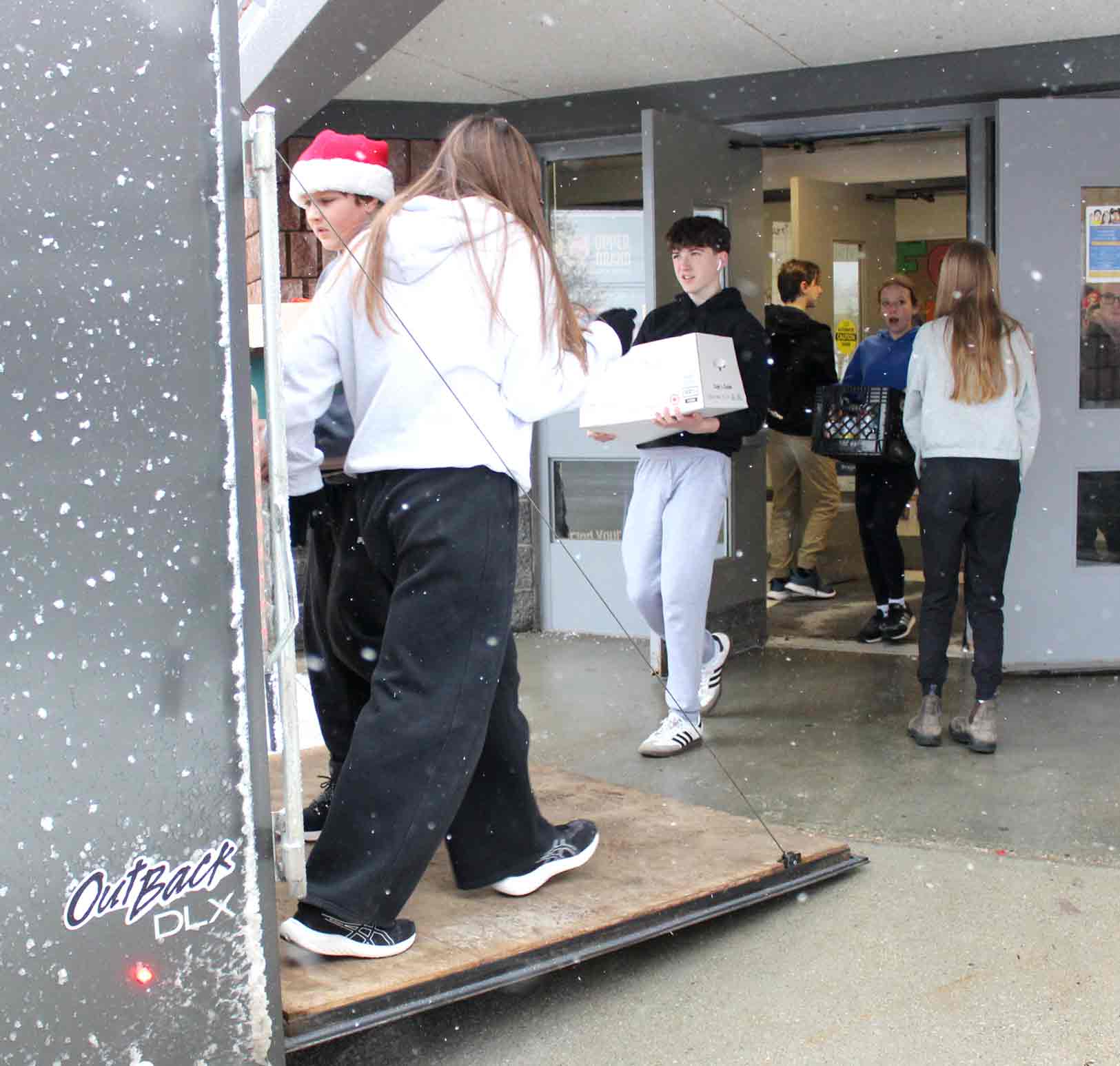 A volunteer from the food bank had parked a trailer outside the school’s main doors, and the students quickly got to work loading it up with box after box of donated food.