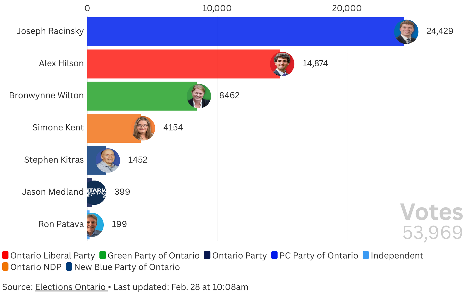 Unofficial results from Elections Ontario have Racinsky winning 24,429 votes (45.26 per cent of votes cast), while Liberal candidate Alex Hilson garnered 14,874 (27.56%), Green Party candidate Bronwynne Wilton had 8,462 (15.68%) and NDP candidate Simone Kent won 4,154 (7.7%).