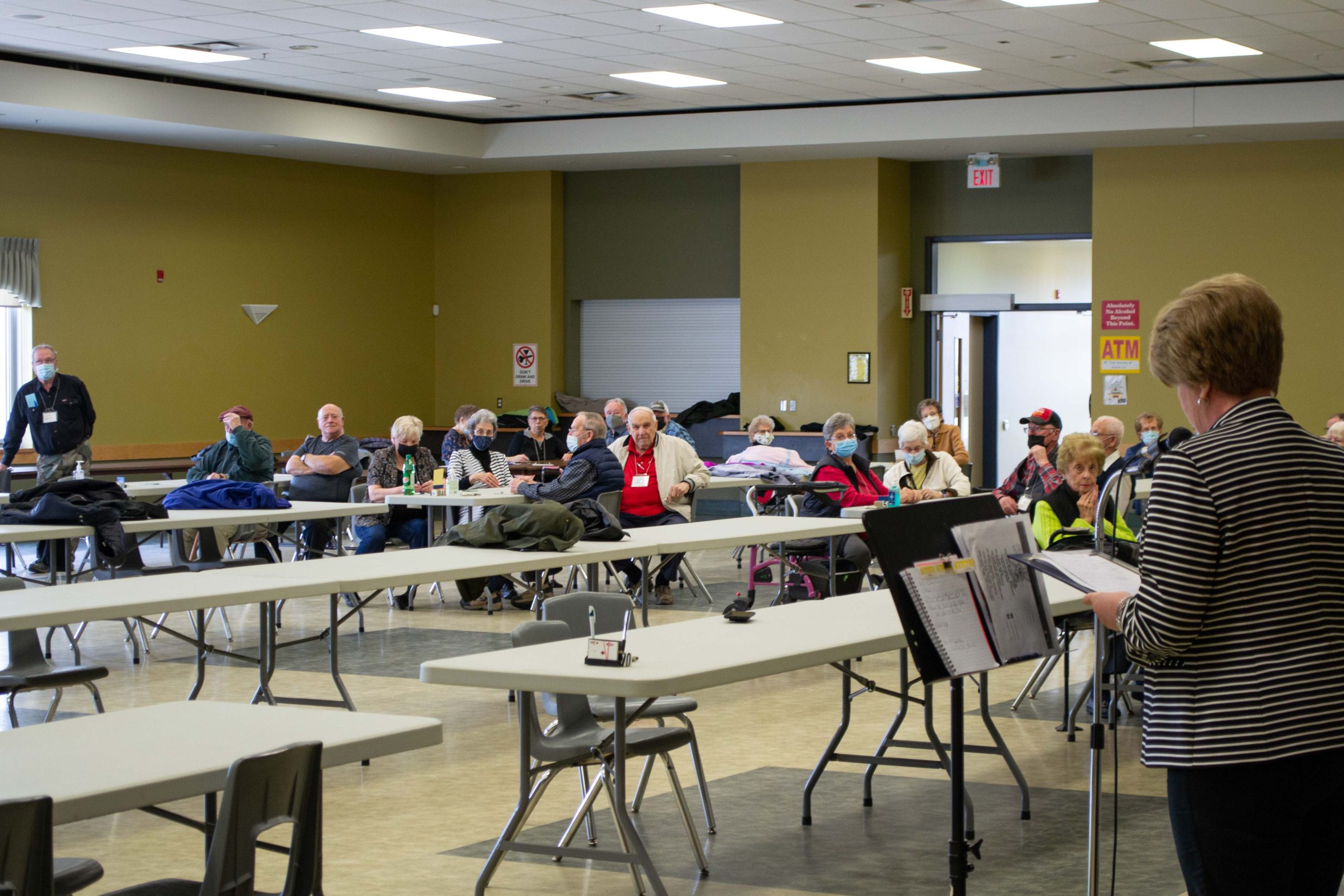 Members of the Mount Forest Seniors Group listen to remarks from Wellington North councillor Sherry Burke before Mount Forest resident Kay Ayres was presented with the township’s 2022 senior of the year award at the Mount Forest and District Sports Complex on April 13. Photo by Jordan Snobelen