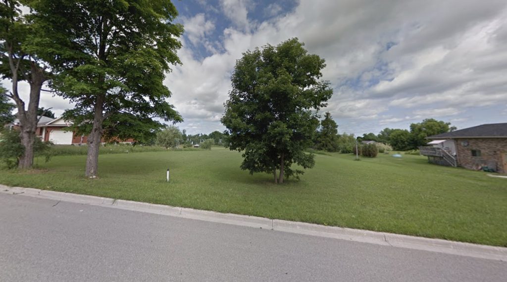 An 18-unit cluster townhouse development is proposed by McTrach Capital and 427 Management Service Inc. on an acre-and-a-half of vacant grassland at 425 and 427 King Street East in Mount Forest, narrowly situated between two detached residences. (Google Streetview)