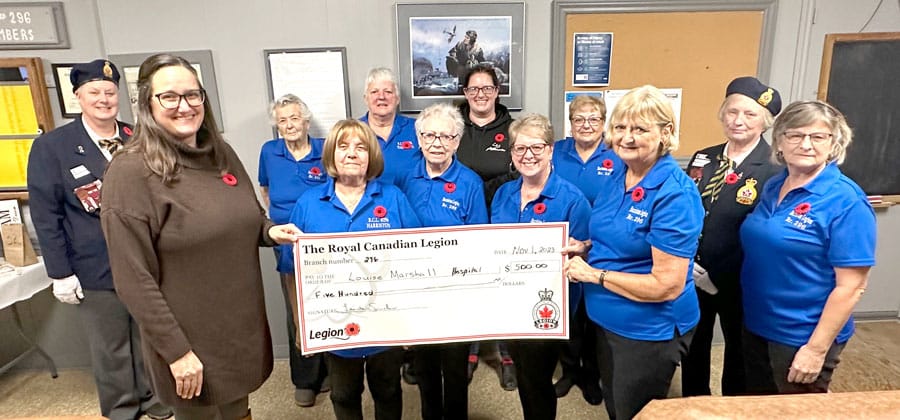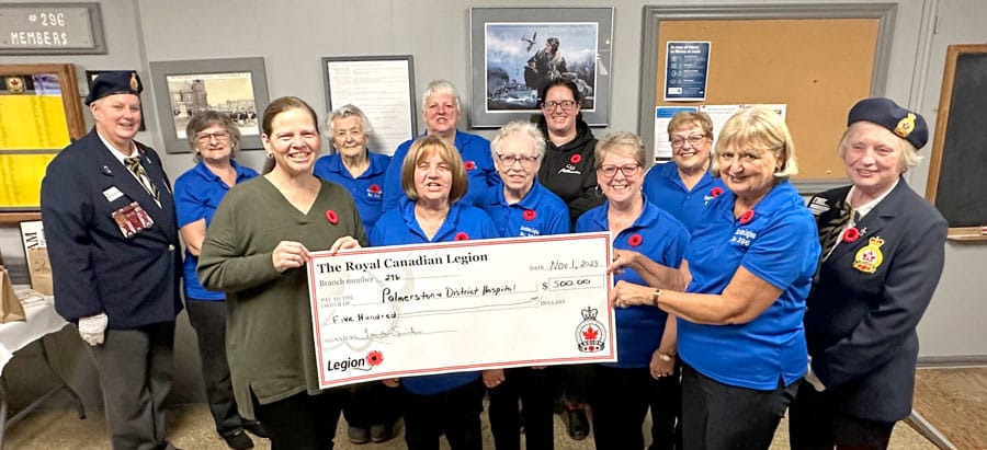 The Harriston Legion Branch 296 Ladies Auxiliary recently made a $500 donation to the Louise Marshall Hospital Foundation. From left: front, foundation development office Amy Van Huss, Marion Murray, Liz Dowler, Sharon McKnight, Branch 296 auxiliary president Linda Sinclair, Hildy Pinkney; back, district commander Zone C3 Joyce McLean, Ethel Forbes, Diane Moore, Sara Dineen, Mary Lou Colwell and deputy commander Zone C3 Frances Hurd. Absent: Yvonne Garness, Tammy Lorenz. Photo by Patrick RaftisThe Harriston Legion Branch 296 Ladies Auxiliary recently made a $500 donation to the Palmerston and District Hospital Foundation. From left: front, foundation development officer Dale Franklin Marion Murray, Liz Dowler, Sharon McKnight, Branch 296 auxiliary president Linda Sinclair and district deputy commander Zone C3 Frances Hurd; back, district commander Zone C3 Joyce McLean, Hildy Pinkney, Ethel Forbes, Diane Moore, Sara Dineen and Mary Lou Colwell. Photo by Patrick Raftis
