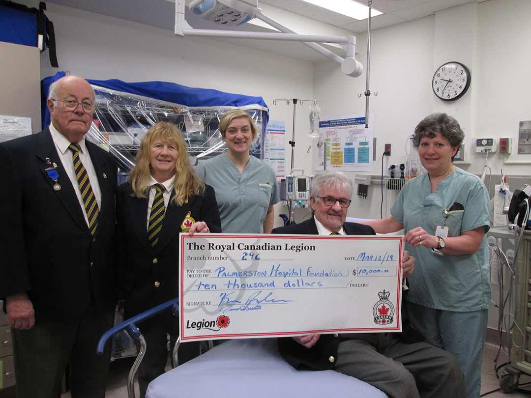 Members of Harriston Legion Branch 296 recently presented the Palmerston and District Hospital Foundation with a cheque for $10,000 from the branch’s Poppy Fund. The money will be used to purchase a specialized stretcher with the ability to weigh an immobile patient. The technology ensures the safety of hospital staff as well as the patient, who may need medication according to body weight. “Branch 296 has continued to serve the community, along with the mandate to remember and care for veterans and their families for more than 80 years,” local Legion officials note. From left: Legion member Ron Smith, poppy chair Anne South, hospital representative Erin Kee-Lindsay, Legion member Gary Thackeray and hospital representative Leola Hartung. Submitted photo