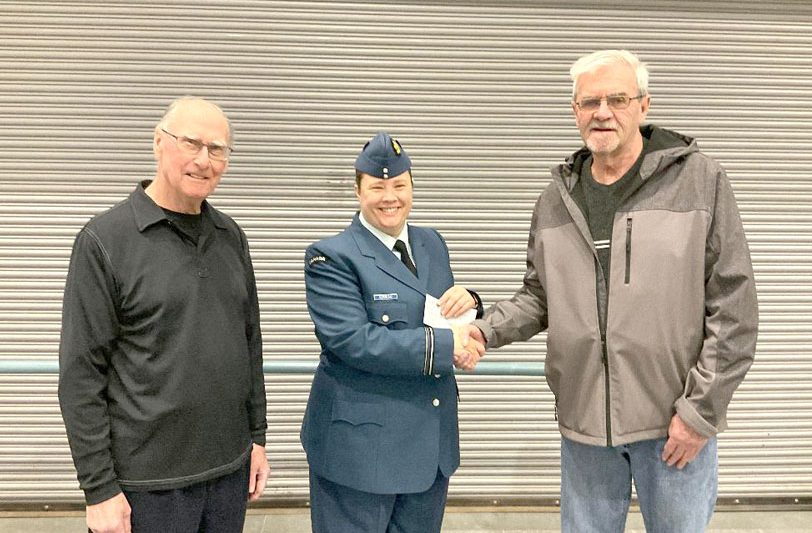 Contribution to cadets – The Mount Forest Legion Branch 134 Catch the Ace Committee presented a $1,500 cheque to the Mount Forest Air Cadet Squadron 895 on March 8. Making the presentation to Captain Cynthia Comeau are Catch the Ace co-chairs Tim Noonan, right, and Jim Florence.