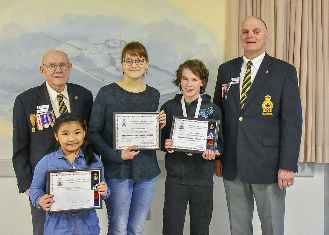 Each year the Royal Canadian Legion offers Youth Education Awards and those who win at the local level can continue to higher levels. Competition categories include poetry, black and white posters and colour posters and more. Three local students went to compete at higher levels and won awards, which were presented at the regular Fergus Legion’s meeting on April 17. The three winners are, from left: Nixiah Penigla, who won fourth place at district primary level for her colour poster and is a student at St Joseph’s Catholic School; Rebekah Harlaar, who won third place at the district senior level for her black and white poster and is a student at Emmanual Christian High School; and Sam Hegedus, who won first place for his poem in the intermediate division of District C and won third place in the same level at provincials. Hegedus is home schooled. Fred Hiller, left, is the chair of the event and Randy Graham is the Fergus Legion president.     Photo by Bill Longshaw