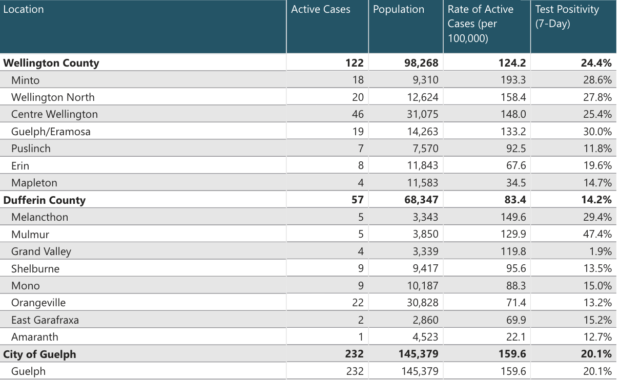There are 57 confirmed active cases in Dufferin County and 232 in Guelph.