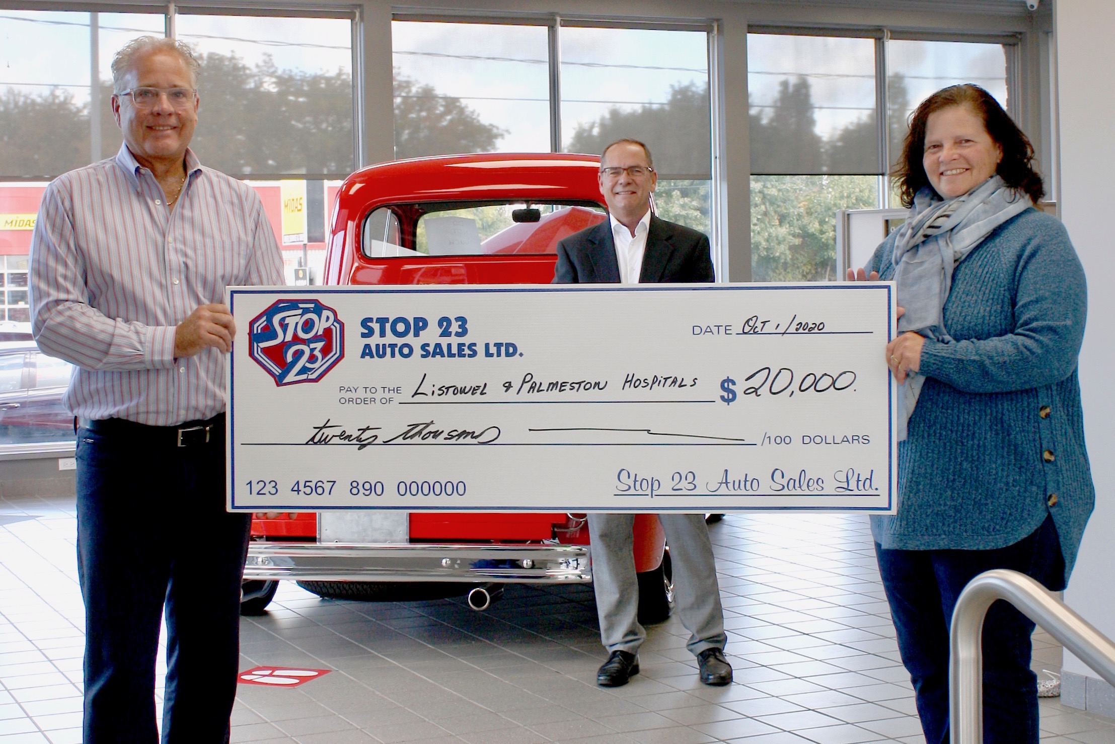 John MacDonald, chair of the Listowel Memorial Hospital Foundation and Dale Franklin, development officer of the Palmerston and District Hospital Foundation, were invited to Stop 23 Auto Sales in Listowel to receive a donation of $10,000 on Oct. 1.
