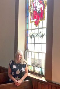 Palmerston United Church council chair Diane Speers stands by one of the recently restored stained glass windows in the church. Submitted photo